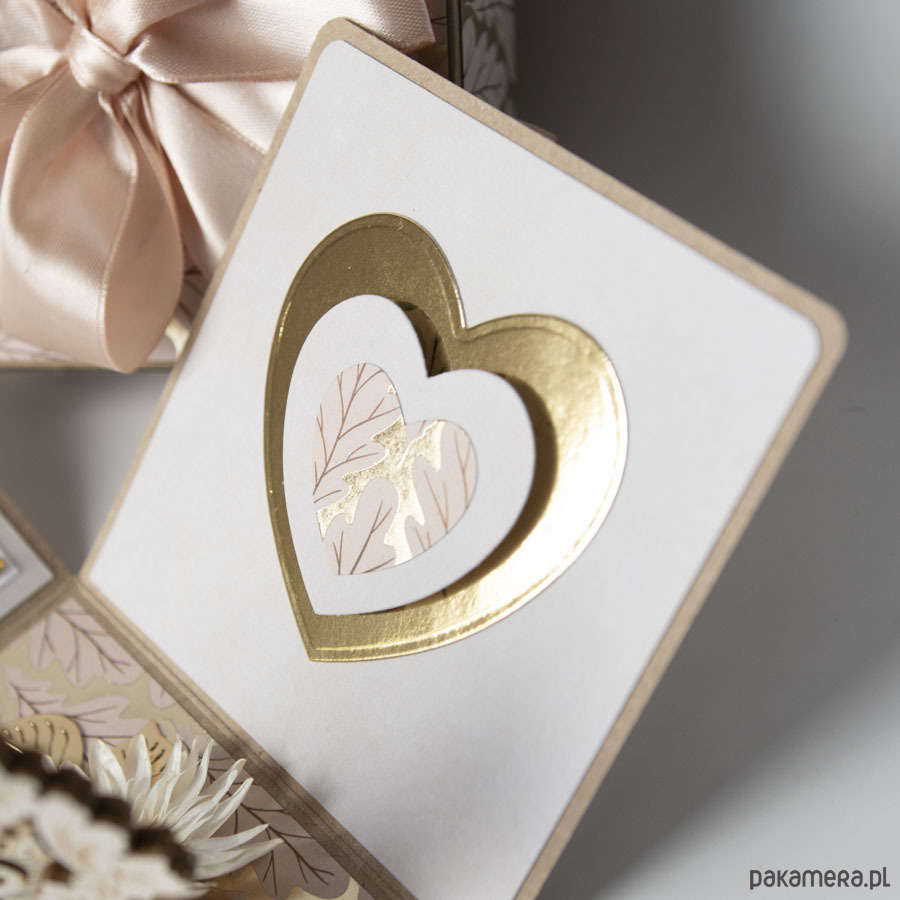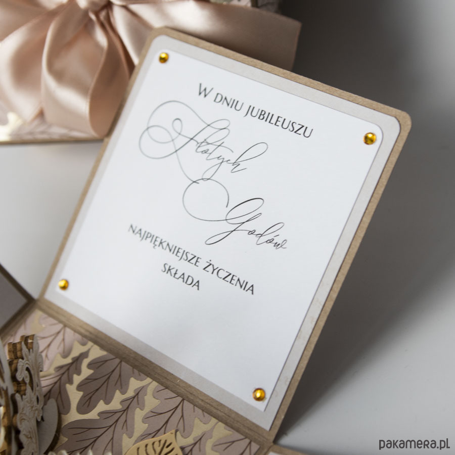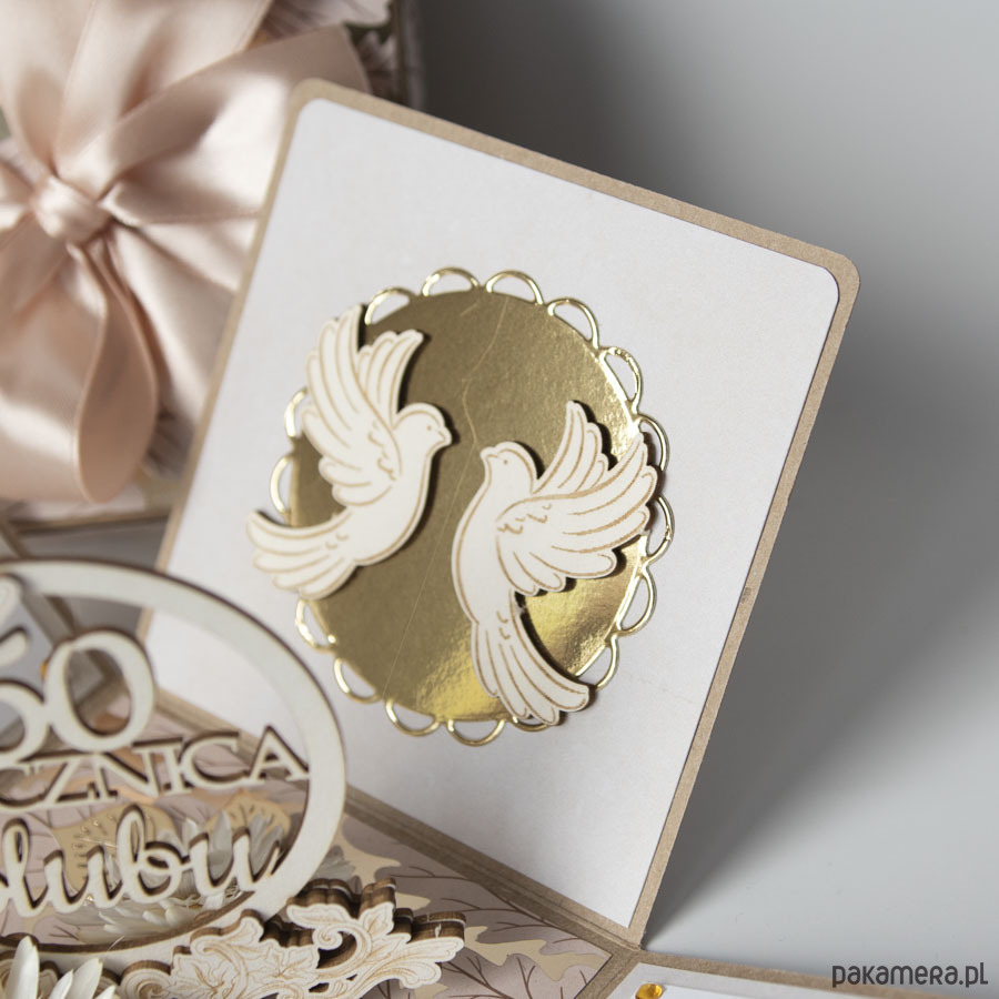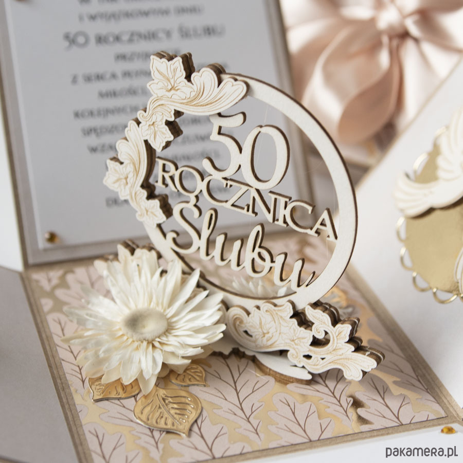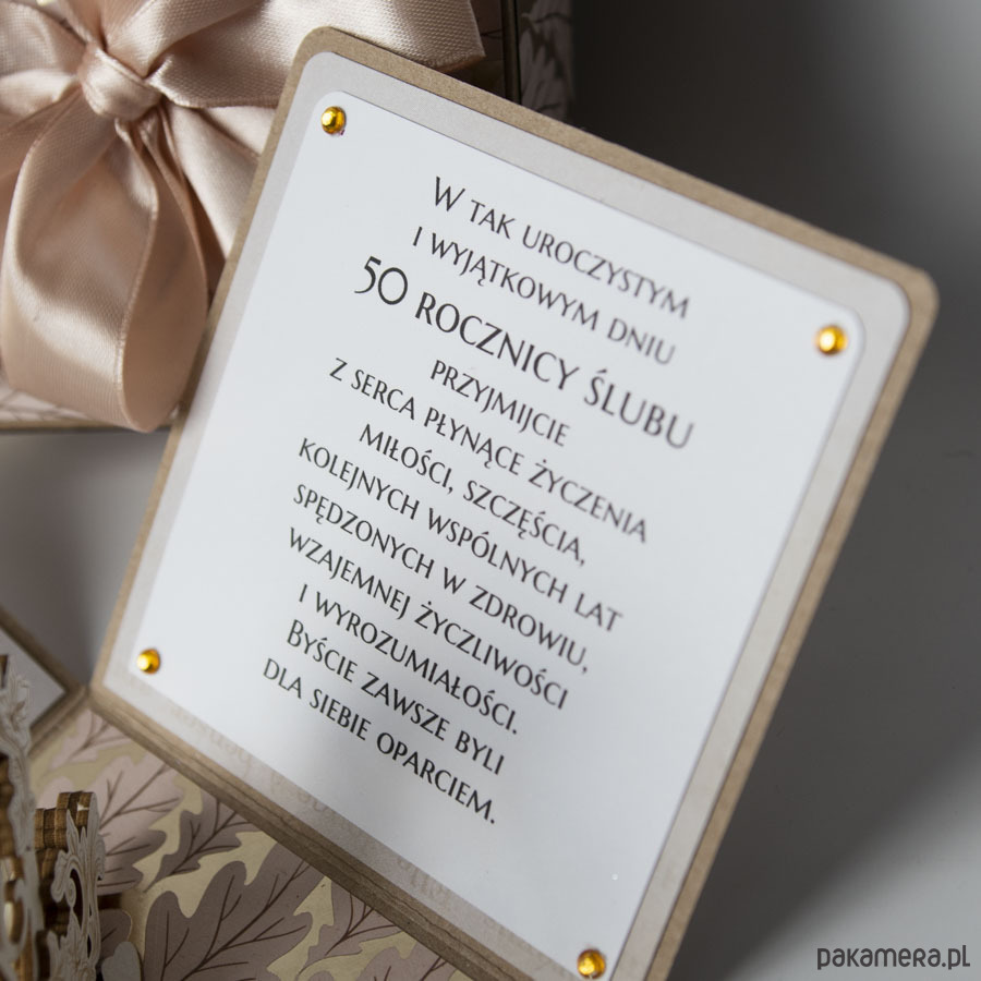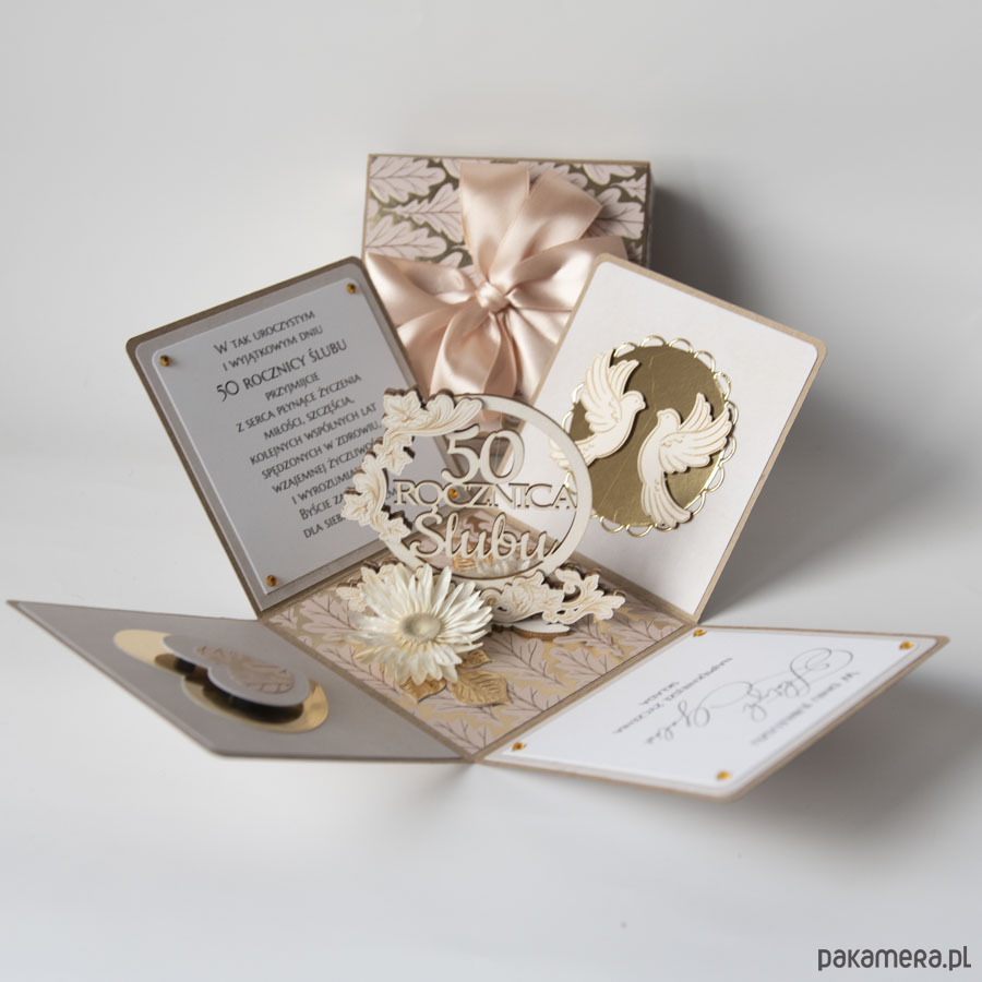 Ręcznie robiona kartka z okazji 50 rocznicy ślubu w formie rozkładanego pudełeczka.