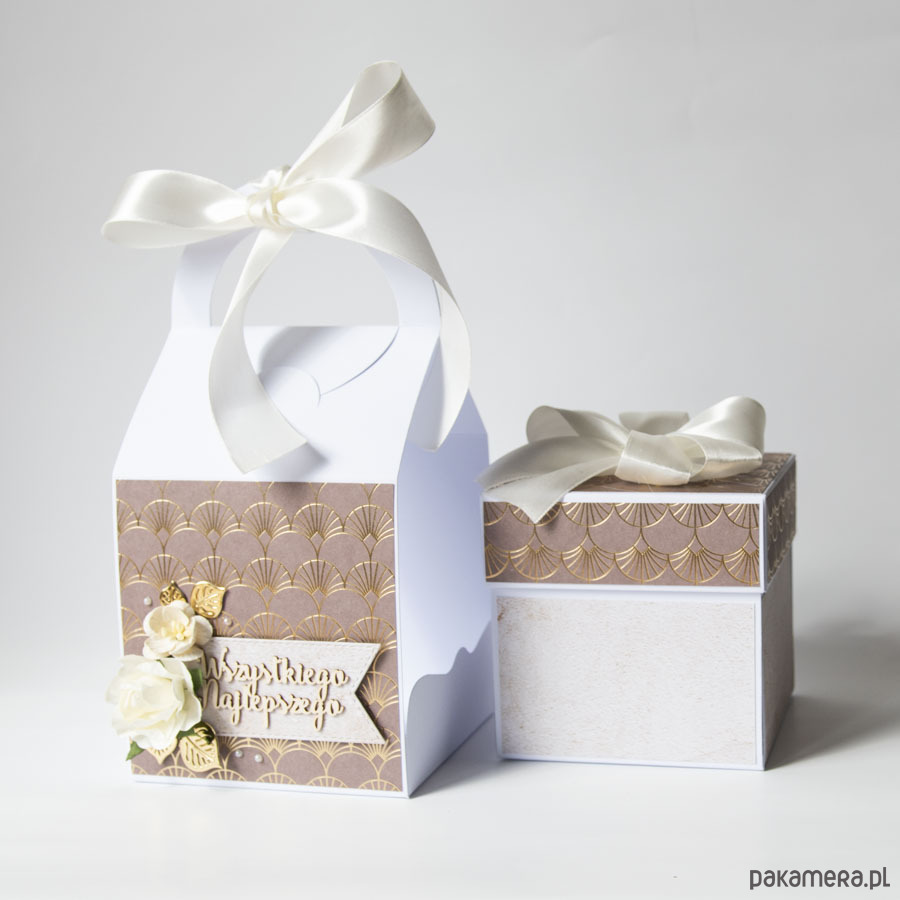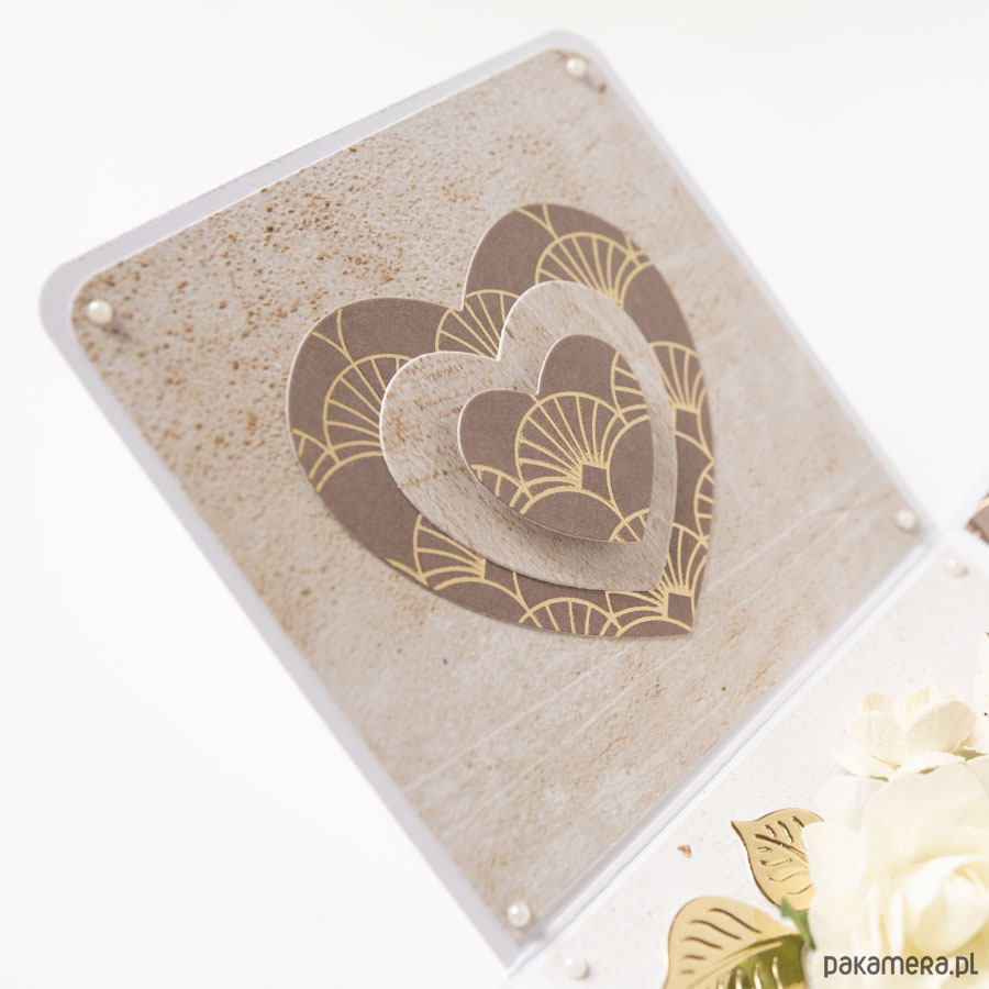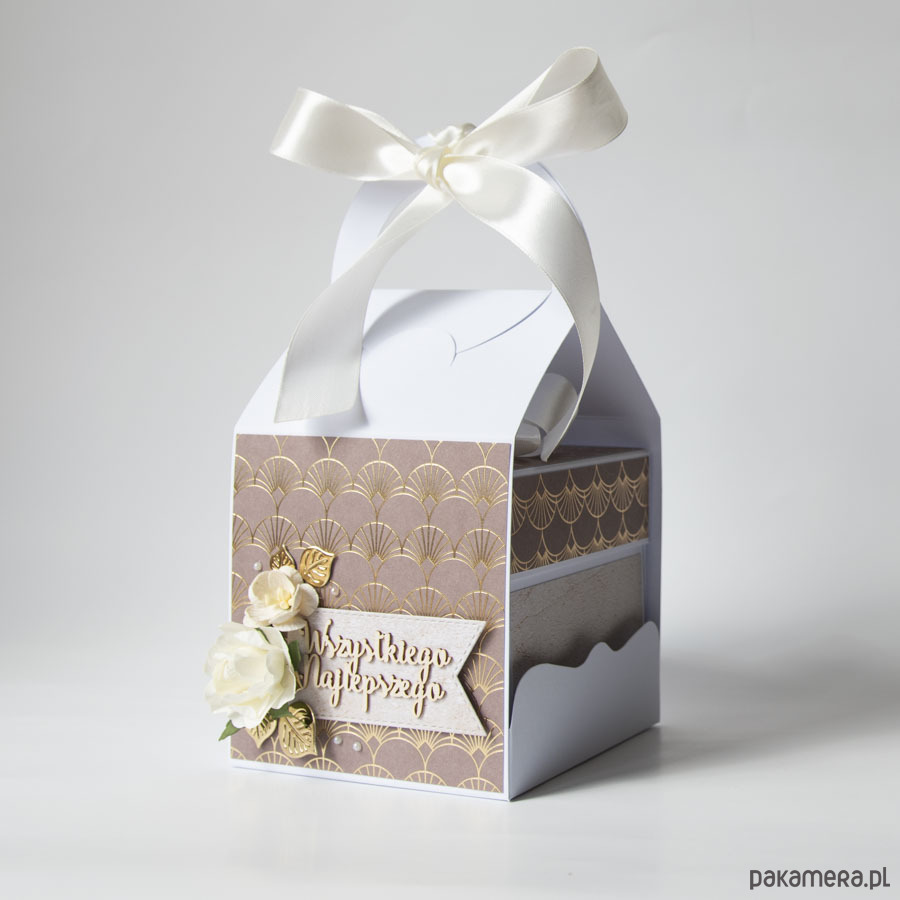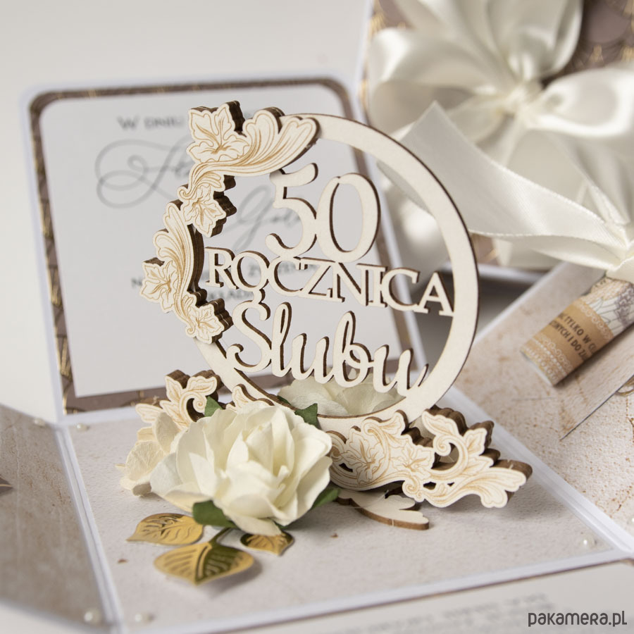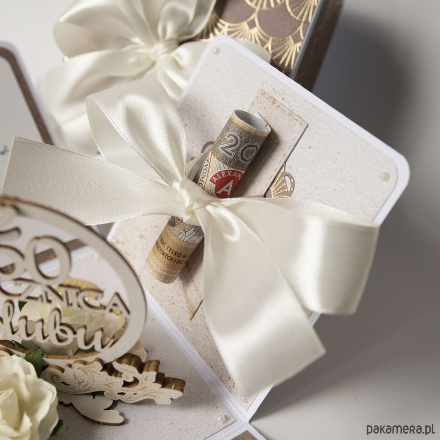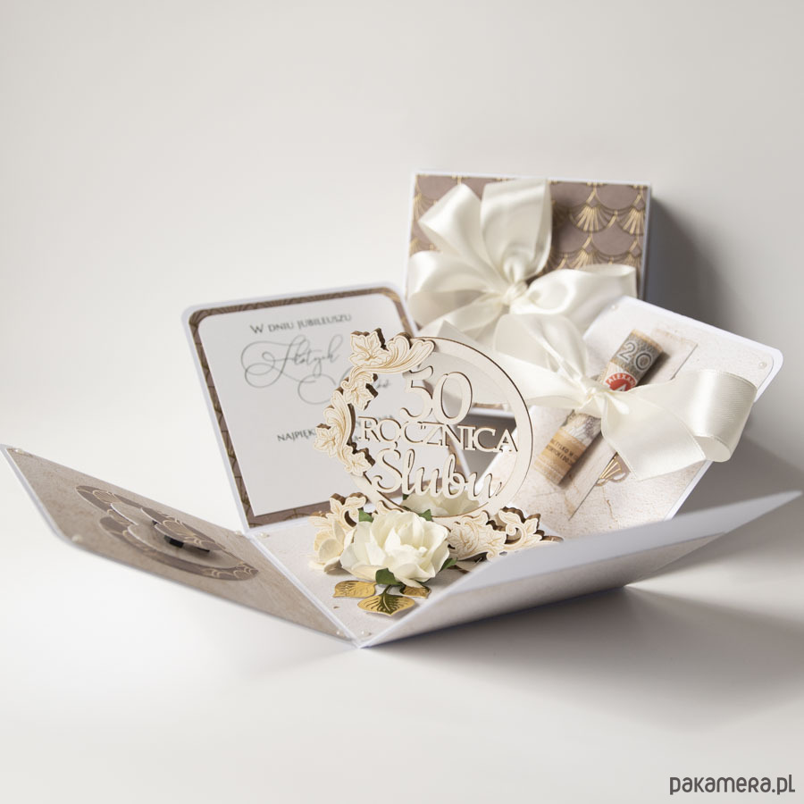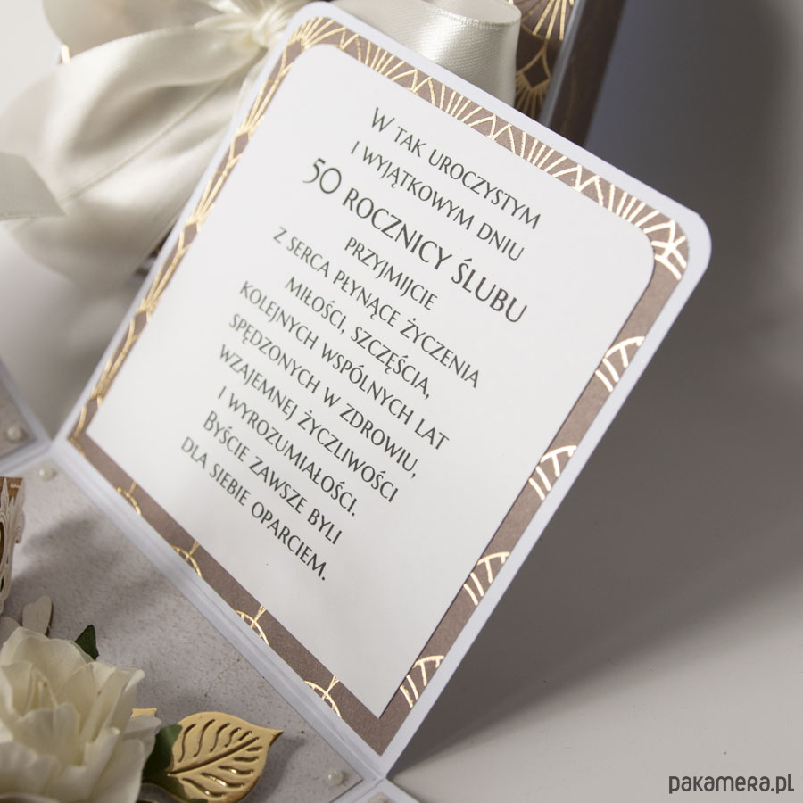 Ręcznie robiona kartka z okazji 50 rocznicy ślubu w formie rozkładanego pudełeczka w komplecie z dopasowaną torebeczką - nosidełkiem