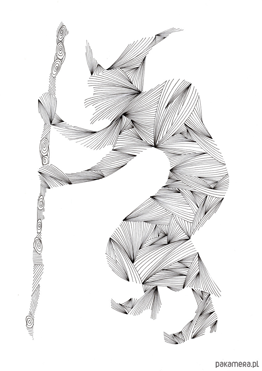 Monochromatyczna, geometryczna ilustracja figuralna przedstawiająca silnie stylizowaną postać wiedźmy. Sylwetka jest zbudowana wyłącznie z ostrych, geometrycznych segmentów i trójkątów, które są wypełnione gęstymi, równoległymi liniami. Laska, również geometryczna, kontrastuje z fragmentacją ciała spiralnymi i koncentrycznymi wzorami. Całość jest osadzona na białym tle, co podkreśla tajemniczość, ruch i analityczną, ukrytą siłę postaci.