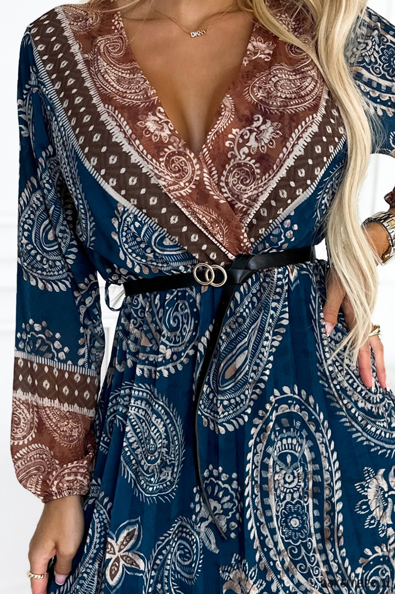 510-1 Plisowana sukienka midi z dekoltem, długim rękawkiem i czarnym paskiem - niebiesko-brązowy wzór - UNI