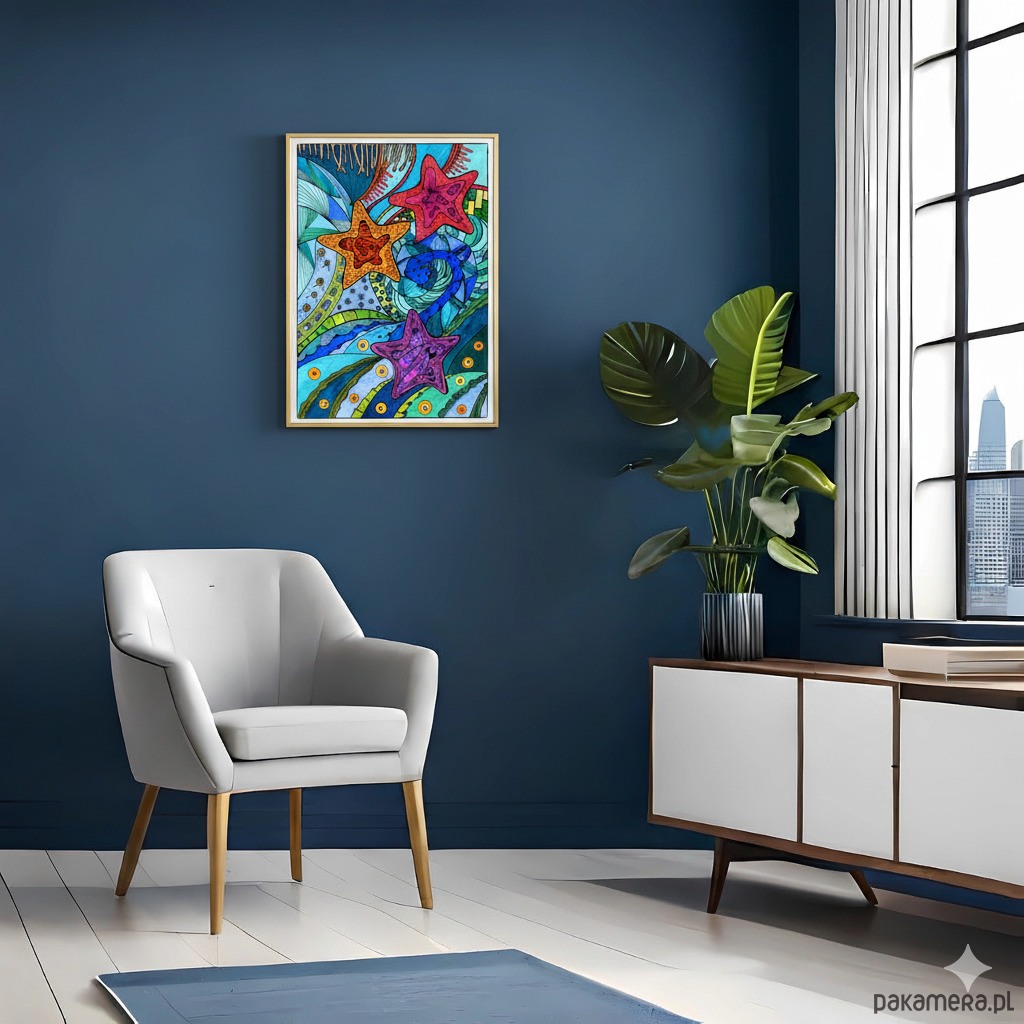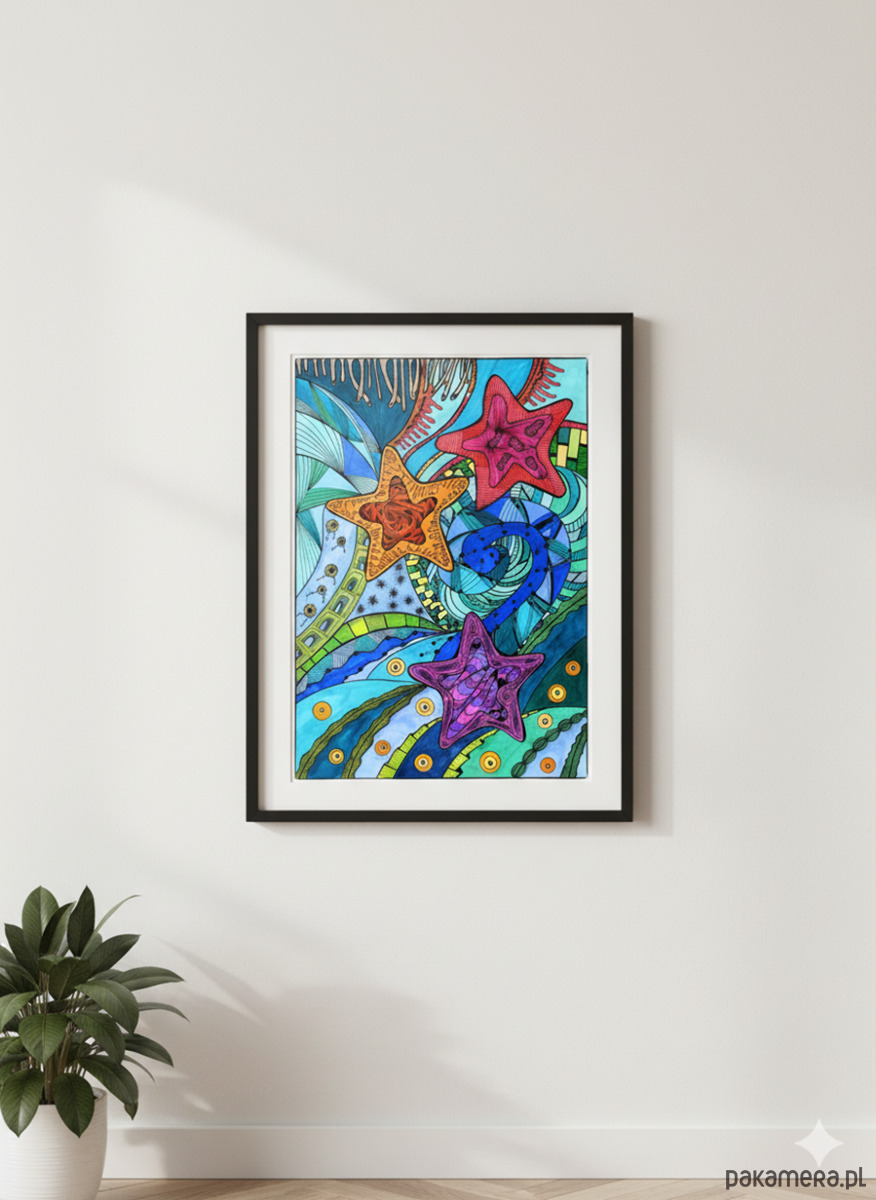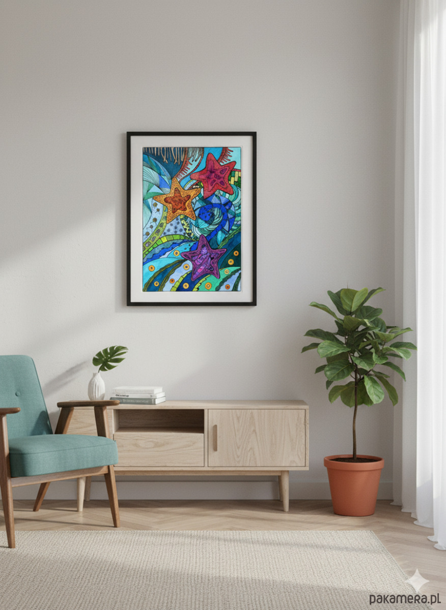 Intensywna, podwodna ilustracja przedstawiająca dynamiczną kompozycję trzech stylizowanych, wielobarwnych rozgwiazd. Rozgwiazdy są osadzone w burzliwym, oceanicznym krajobrazie zdominowanym przez odcienie błękitu, turkusu i zieleni.