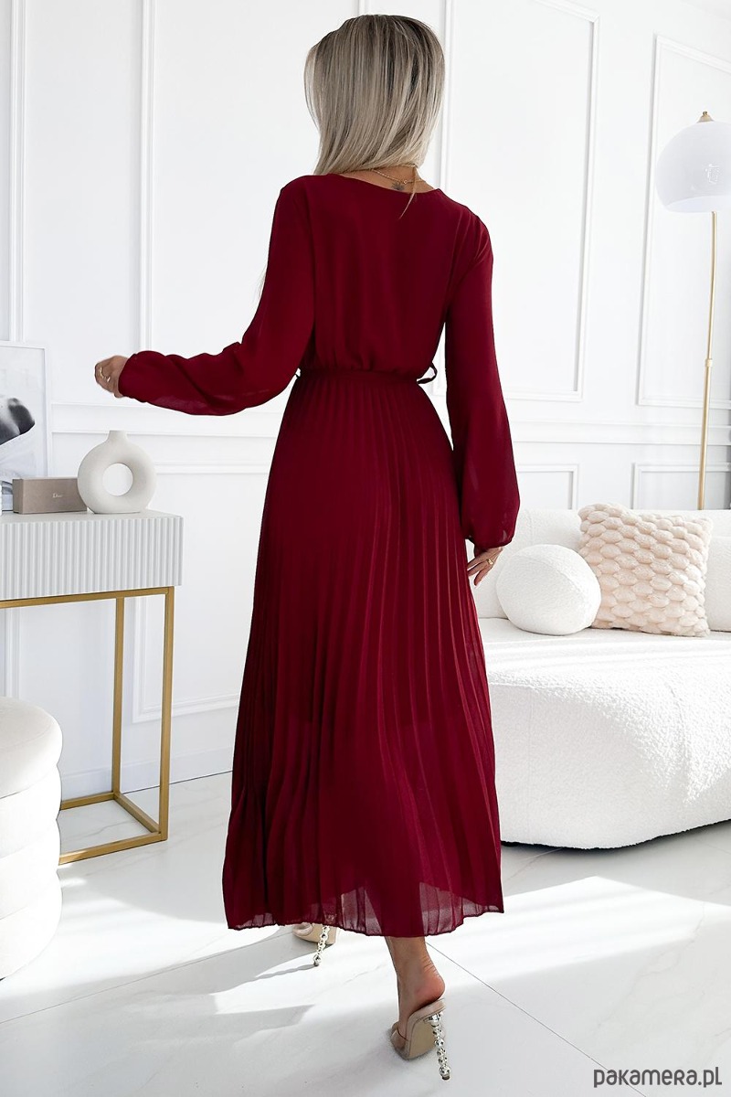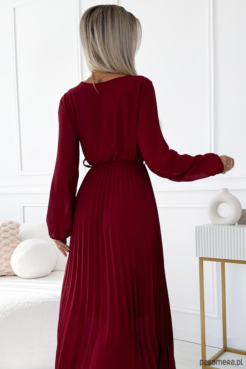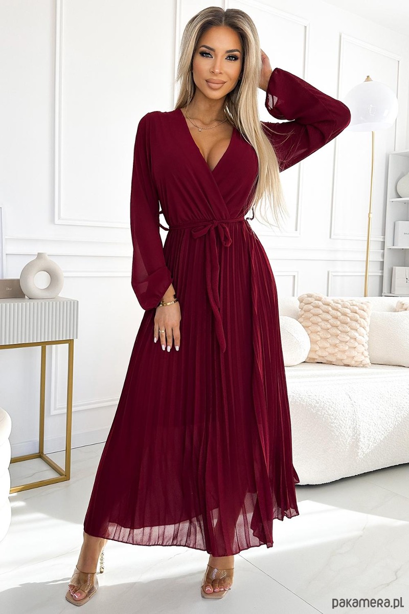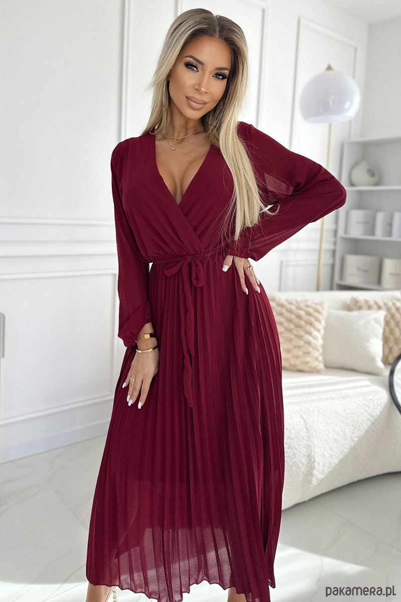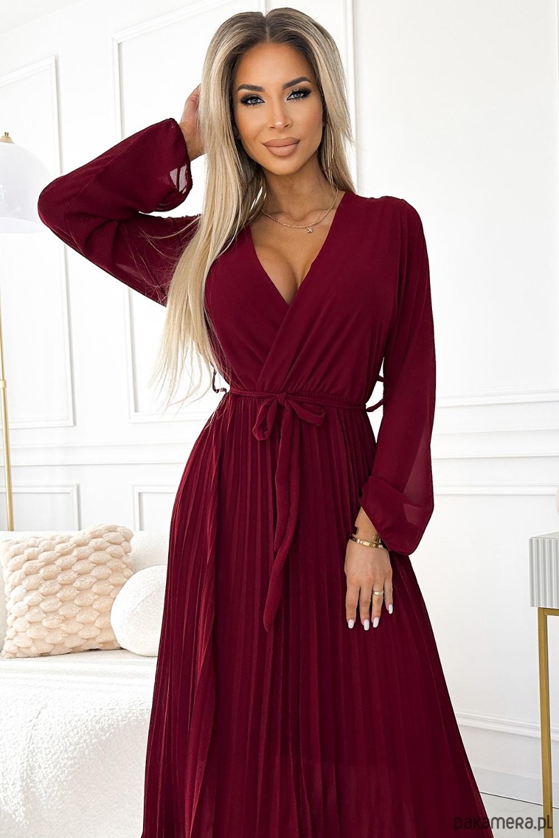 Plisowana szyfonowa sukienka z kopertowym dekoltem, długim rękawkiem i wiązanym paskiem. Uszyta ze zwiewnego materiału w kolorze bordowym. Idealna sukienka na każdą okazję. Marka numoco basic. Produkcja europejska.