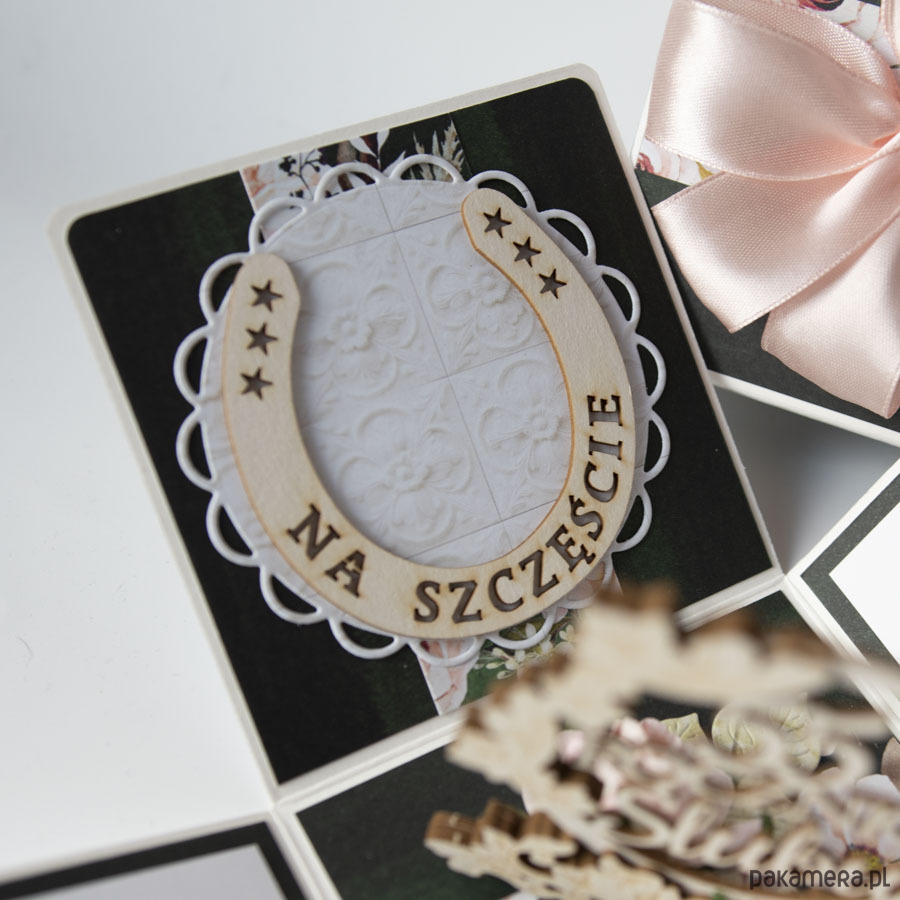Na środku pudełeczka znajduje się dekoracja z papierowymi kwiatuszkami, na ściankach motyw serca, życzenia dla solenizantów, miejsce na podpis oraz podkowa na szczęście.