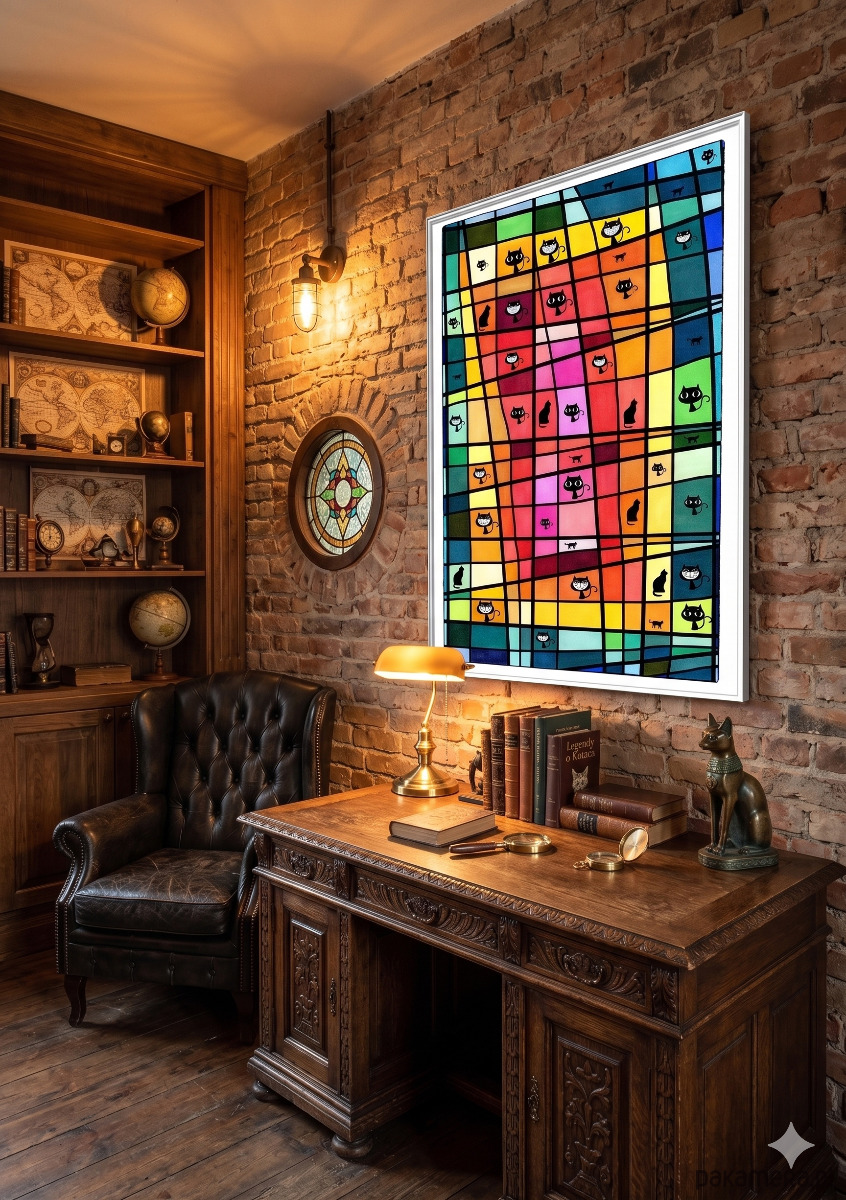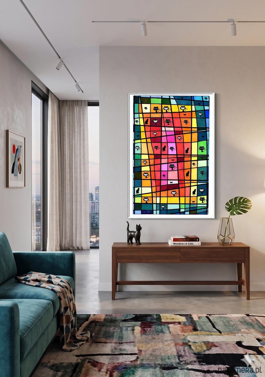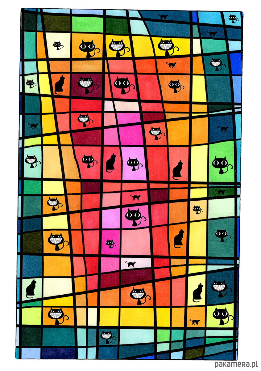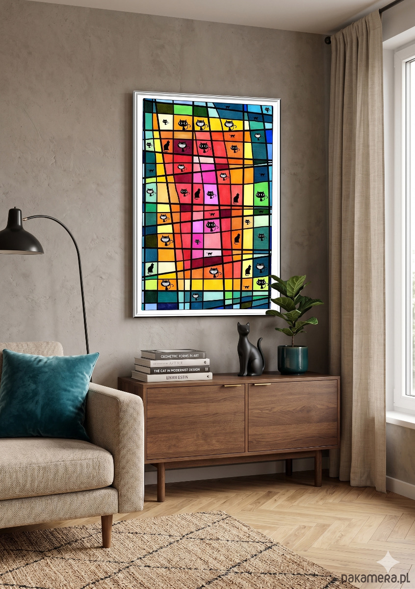 Dekoracyjna, pionowa ilustracja o strukturze mozaiki miejskich okien. Wewnątrz tych barwnych bloków umieszczone są liczne, stylizowane sylwetki kotów – niektóre uśmiechnięte i stylizowane na pop-art, inne jako czarne cienie. Rysunek łączy geometryczny porządek z dziką, nocną, kocią energią.
