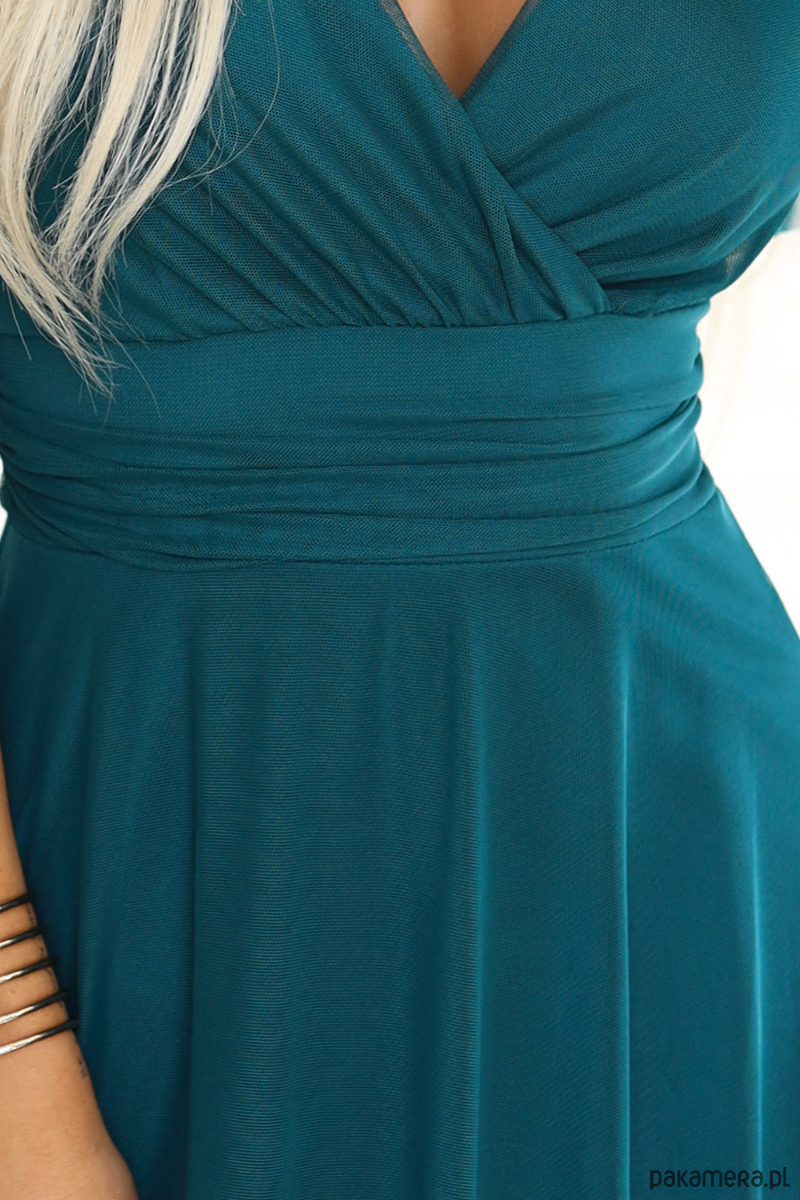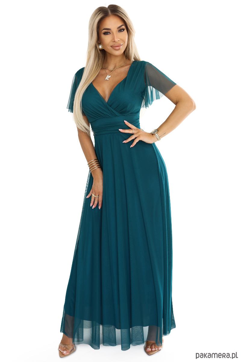 562-4 NASTIA Długa sukienka z dekoltem i krótkim rękawkiem - zielona