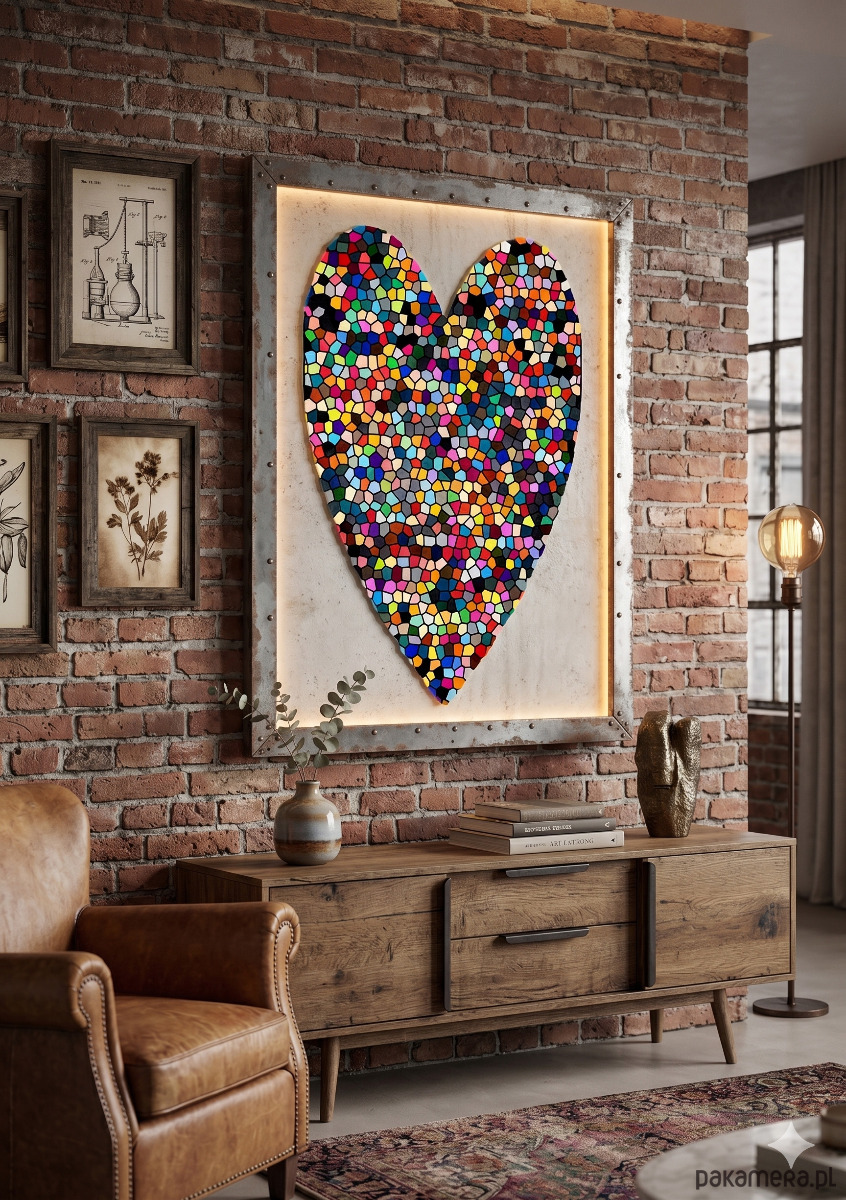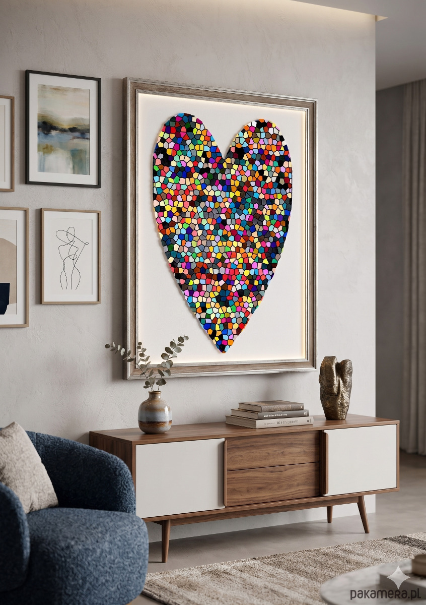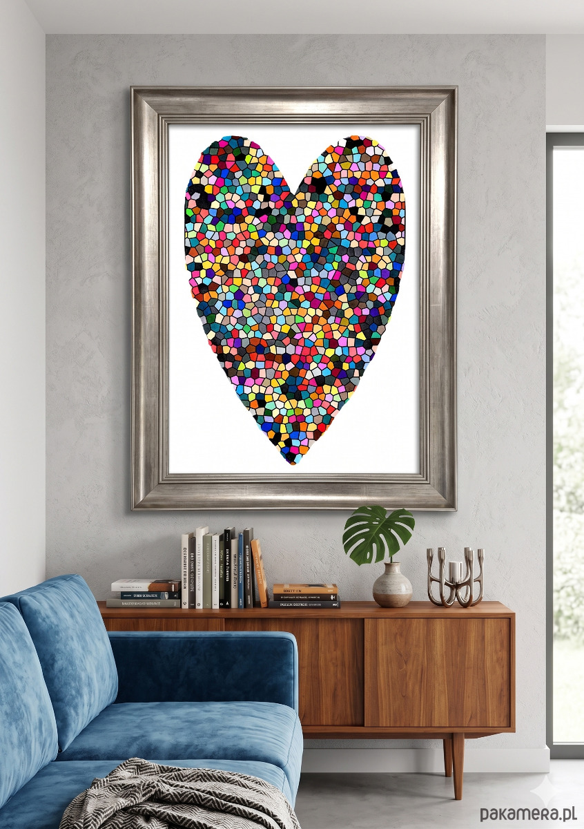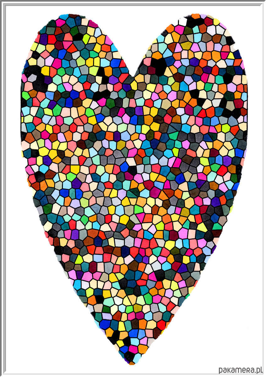 Dekoracyjna, jaskrawa ilustracja przedstawiająca kształt serca wypełniony mozaiką nieregularnych, geometrycznych fragmentów. Rysunek symbolizuje złożoność, pełnię i bogactwo emocji zorganizowanych w spójną, ale dynamiczną całość.