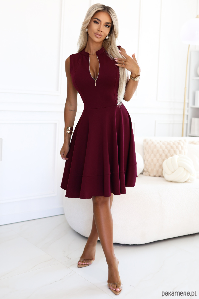 573-4 Ekskluzywna sukienka z rozkloszowanym dołem i zamkiem - bordowa