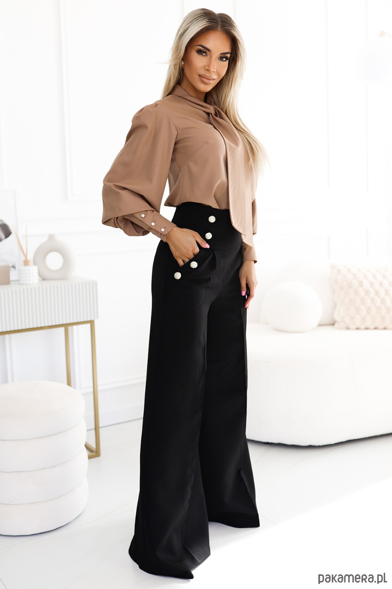 578-1 Wyjątkowa biznesowa bluzka z długim rękawkiem, wiązaniem i guzikami - kolor karmelowy - mocha mousse - XL
