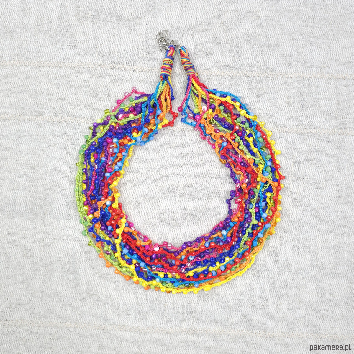 Ręcznie robiony, z 15 cienkich sznurków, które splatają się w barwną, wielowarstwową kompozycję. Każdy sznurek ozdobiony jest drobnymi, szklanymi koralikami o średnicy 3-4 mm, które mienią się w odcieniach tęczy, od soczystej czerwieni, przez pomarańcz, żółty, zielony, aż po głęboki błękit i fiolet.