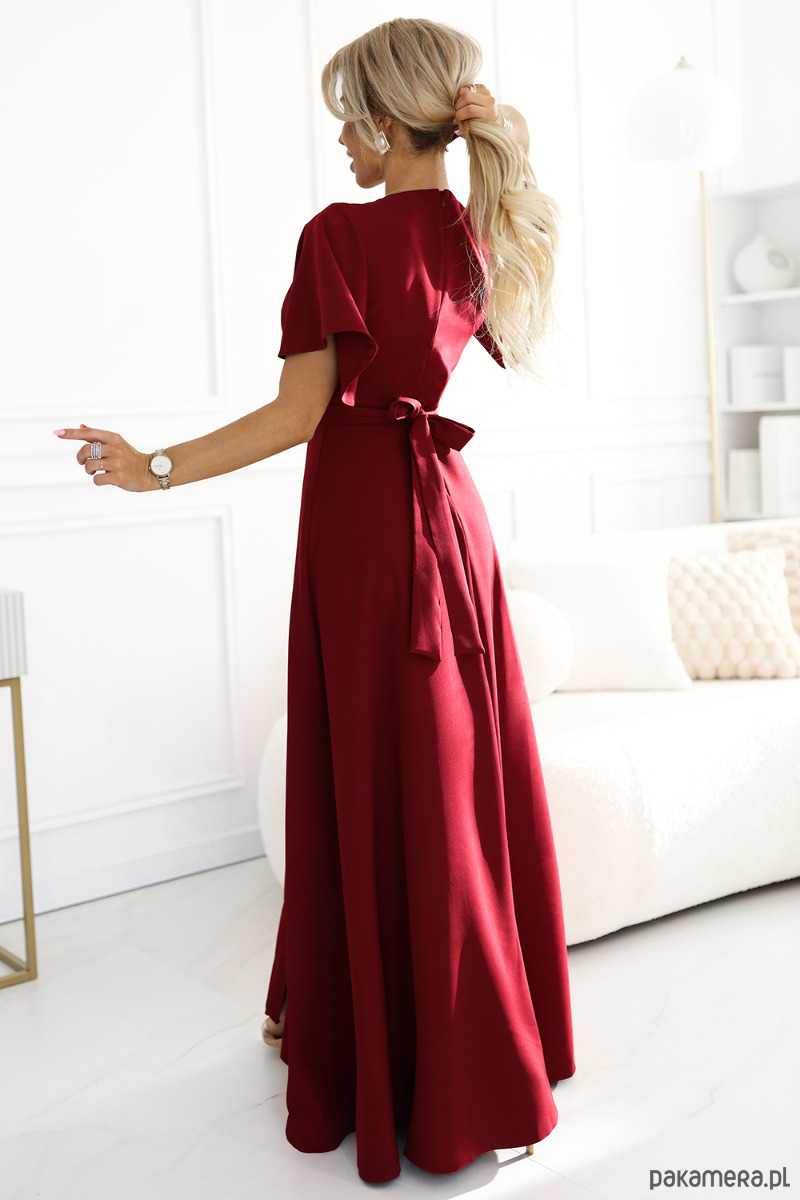581-2 JENNIFER długa suknia z rozcięciem na nogę, rękawkiem i dekoltem - BORDOWA