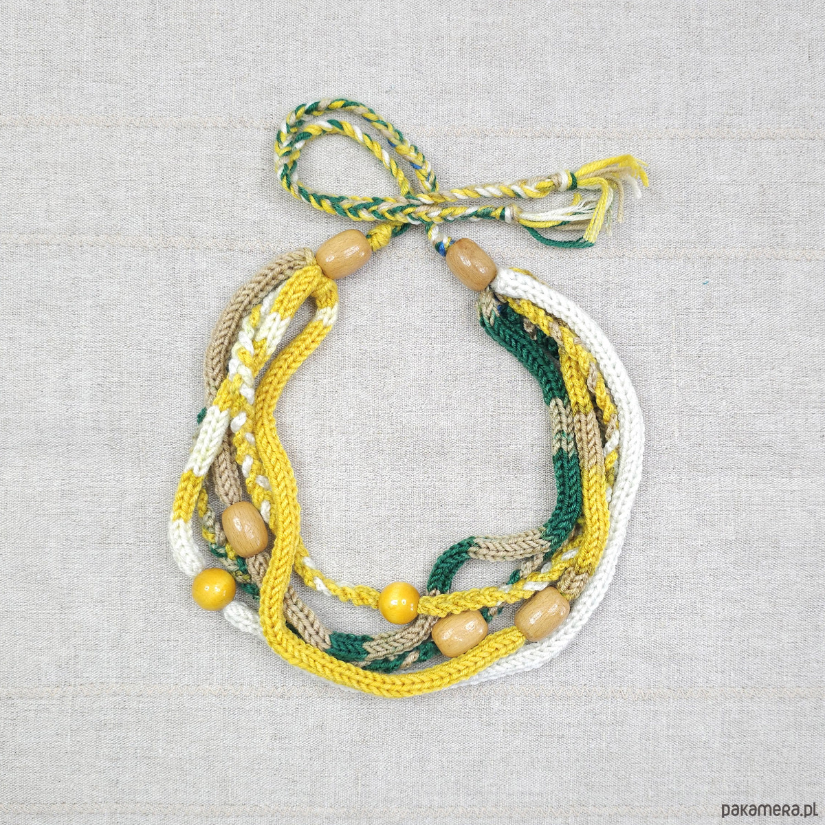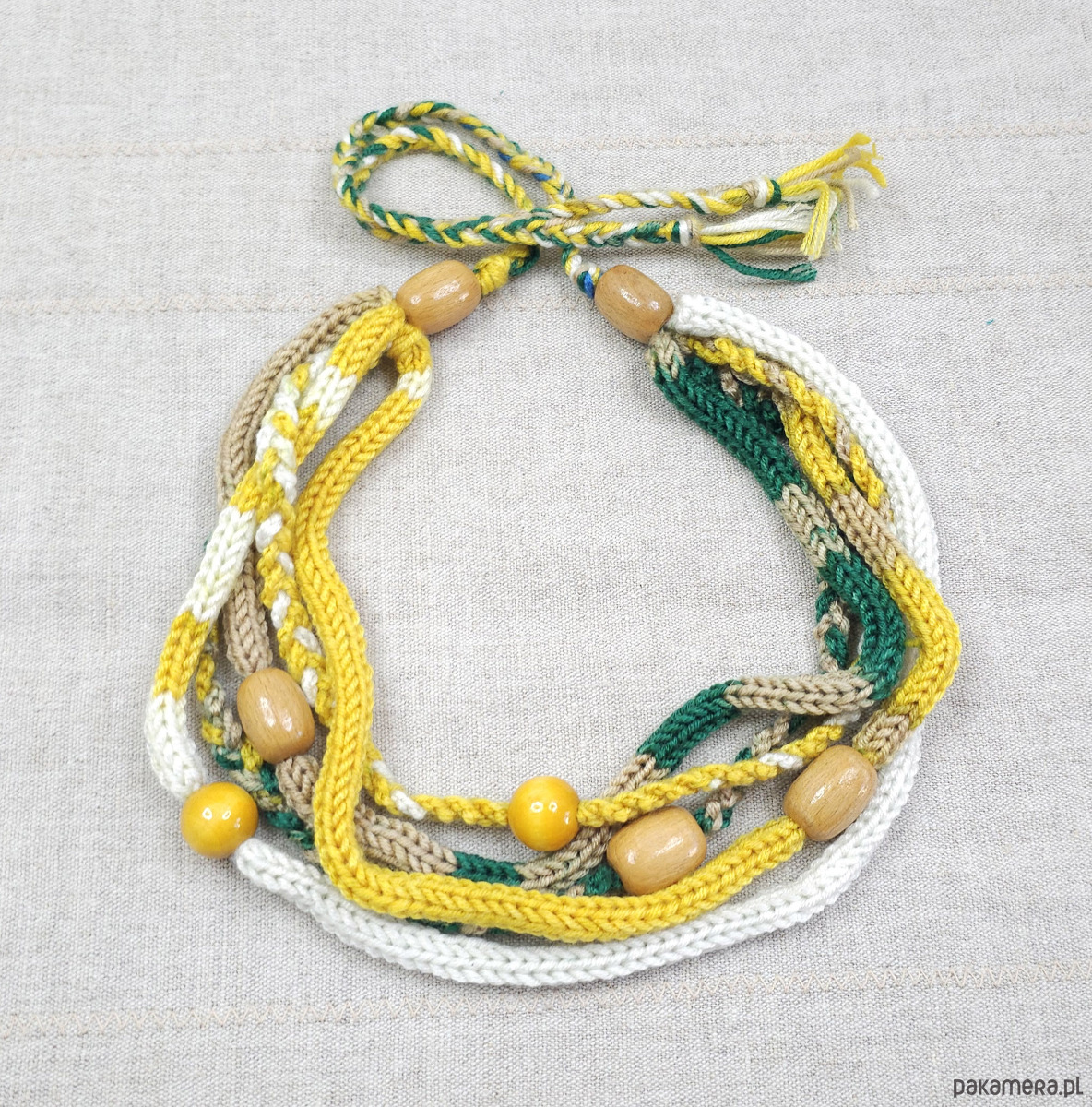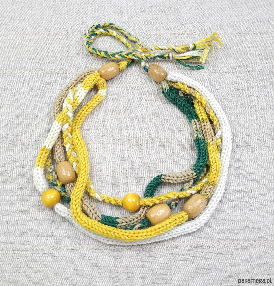 Połączenie miękkiej włóczki w odcieniach butelkowej zieleni, musztardowej żółci, bieli i beżu z naturalnymi, drewnianymi koralikami tworzy harmonijną kompozycję.