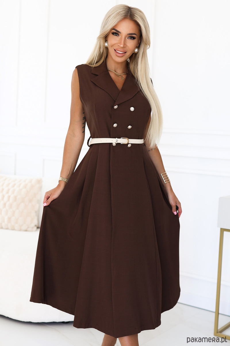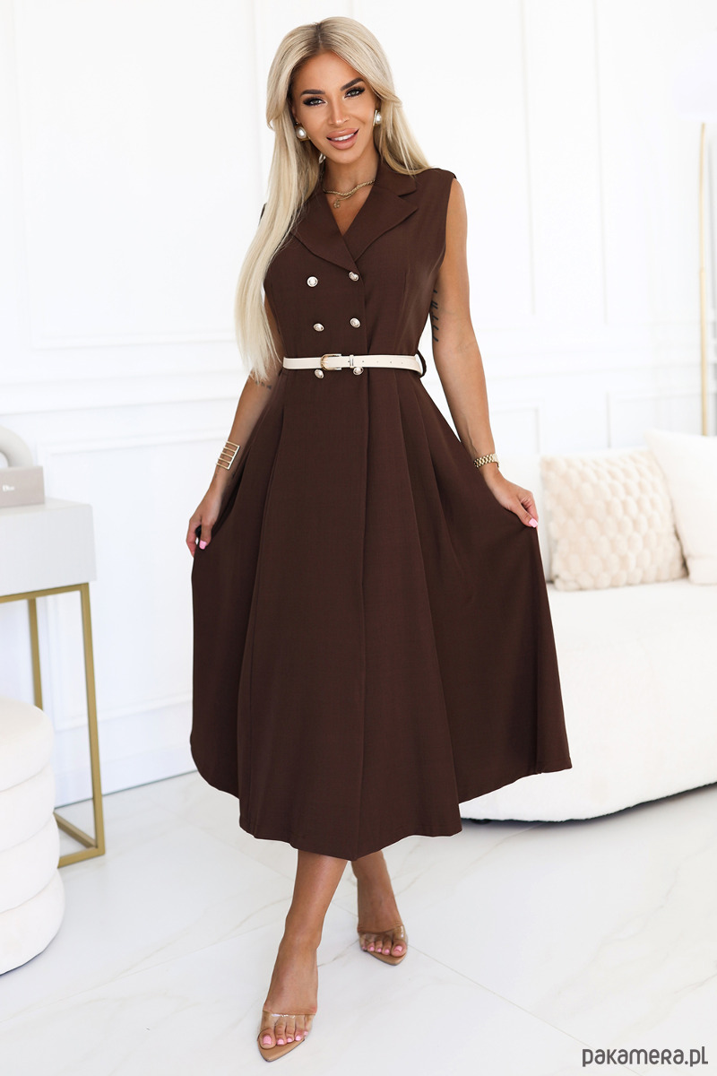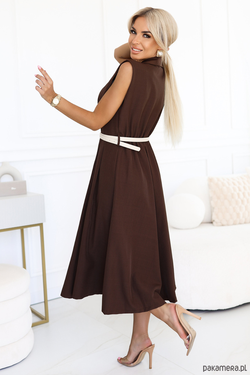 Elegancka szmizjerka midi Numoco Basic w kolorze czekoladowym — uniwersalna propozycja łącząca klasykę z nowoczesnym krojem. Sukienka o koszulowym fasonie z klasycznym kołnierzykiem i zapięciem na złote guziki z przodu sprawdzi się zarówno w biurze, jak i na uroczystościach czy podczas stylowego wyjścia. Model bez rękawów z paskiem w talii pięknie podkreśla sylwetkę, a rozkloszowany dół dodaje lekkości i swobody ruchu.