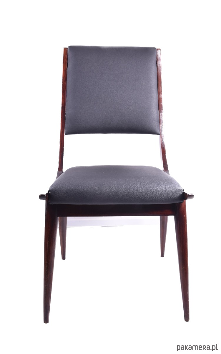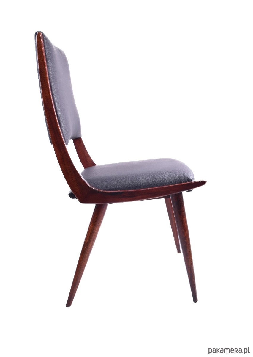Forma krzeseł – smukłe, zwężane nogi i lekko wygięte oparcie – to klasyka włoskiego modernizmu lat 50., styl Boomerang w duchu projektów Gio Pontiego i Ico Parisi.