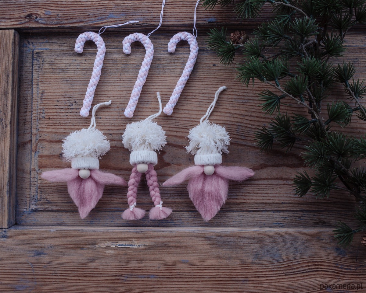 Zestaw 6 ozdób choinkowych wykonanych ze sznurka bawelnianego i wełny w kolorze  bialym i  różowym.. Pakowany w ozdobne pudełko przez co mogą być fajnym prezentem