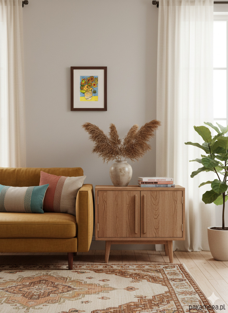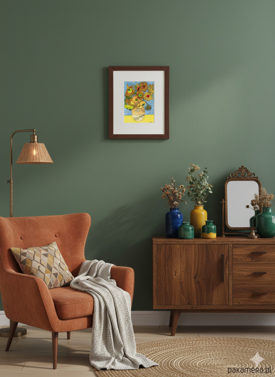Intensywne odcienie żółtego i pomarańczowego dominują w kwiatach, które są dynamiczne i lekko zdeformowane. Odróżnia je jednak precyzyjne wypełnienie detalami (wzory geometryczne i organiczne) w centrach kwiatów i na wazonie. Tło jest proste — niebieska ściana i żółty stół — co podkreśla kontrast między ekspresją a medytacyjnym detalem.