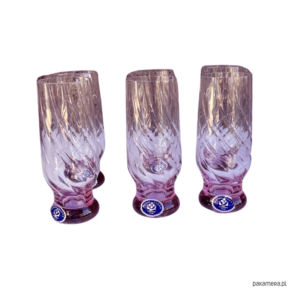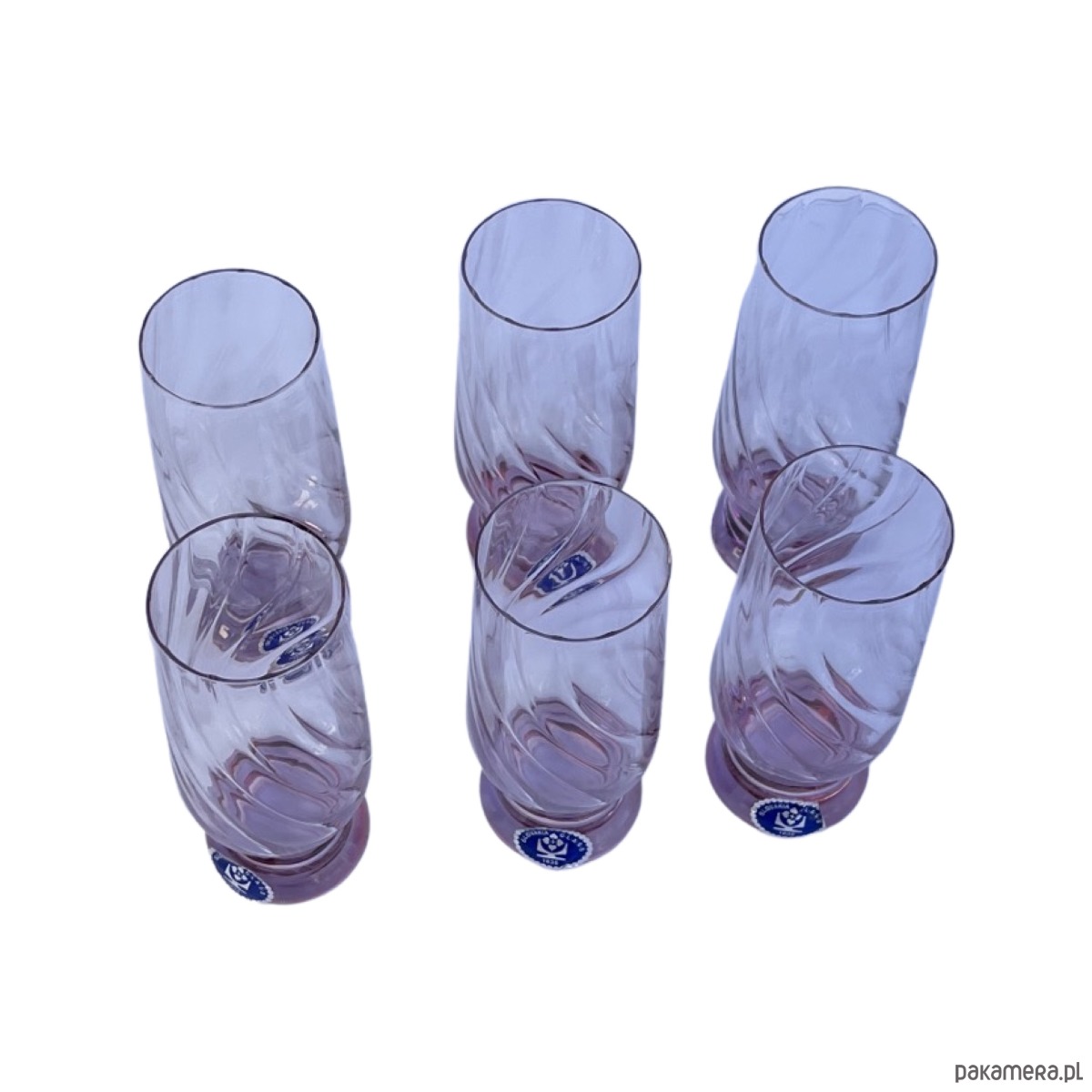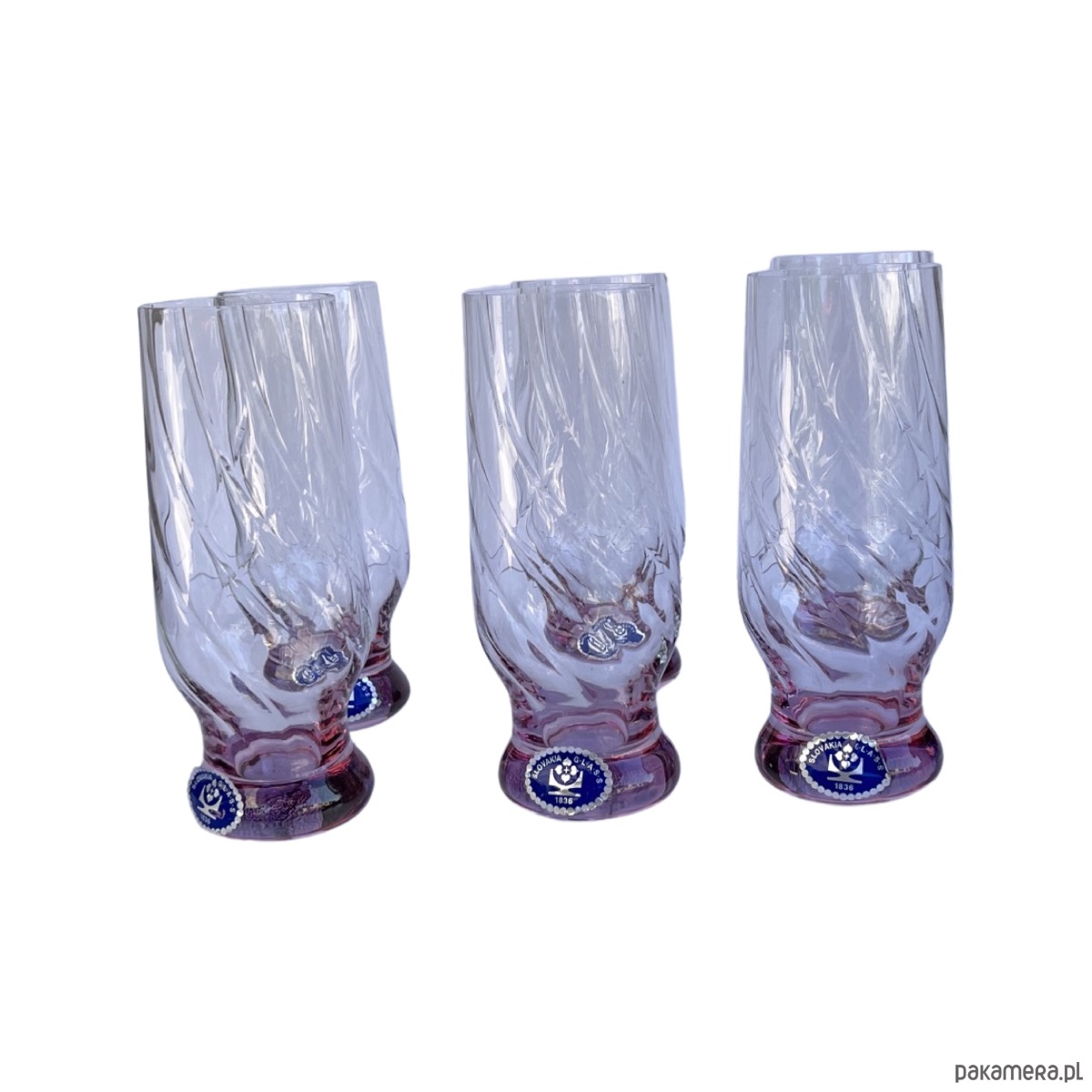 Komplet szklanek wysokoch szklanek zaprojektowanych przez Josefa Stanika wyprodukowanych w latach 1956-1989 w Słowacji przez Zlatno Sklarna. Szklanki do drinków wykonane ręcznie ze szkła neodymowego. Szklanki zachowane w stanie oryginalnym nowe nigdy nie używane. Szklanki w oryginalnym opakowaniu, z zachowanymi naklejkami producenta.