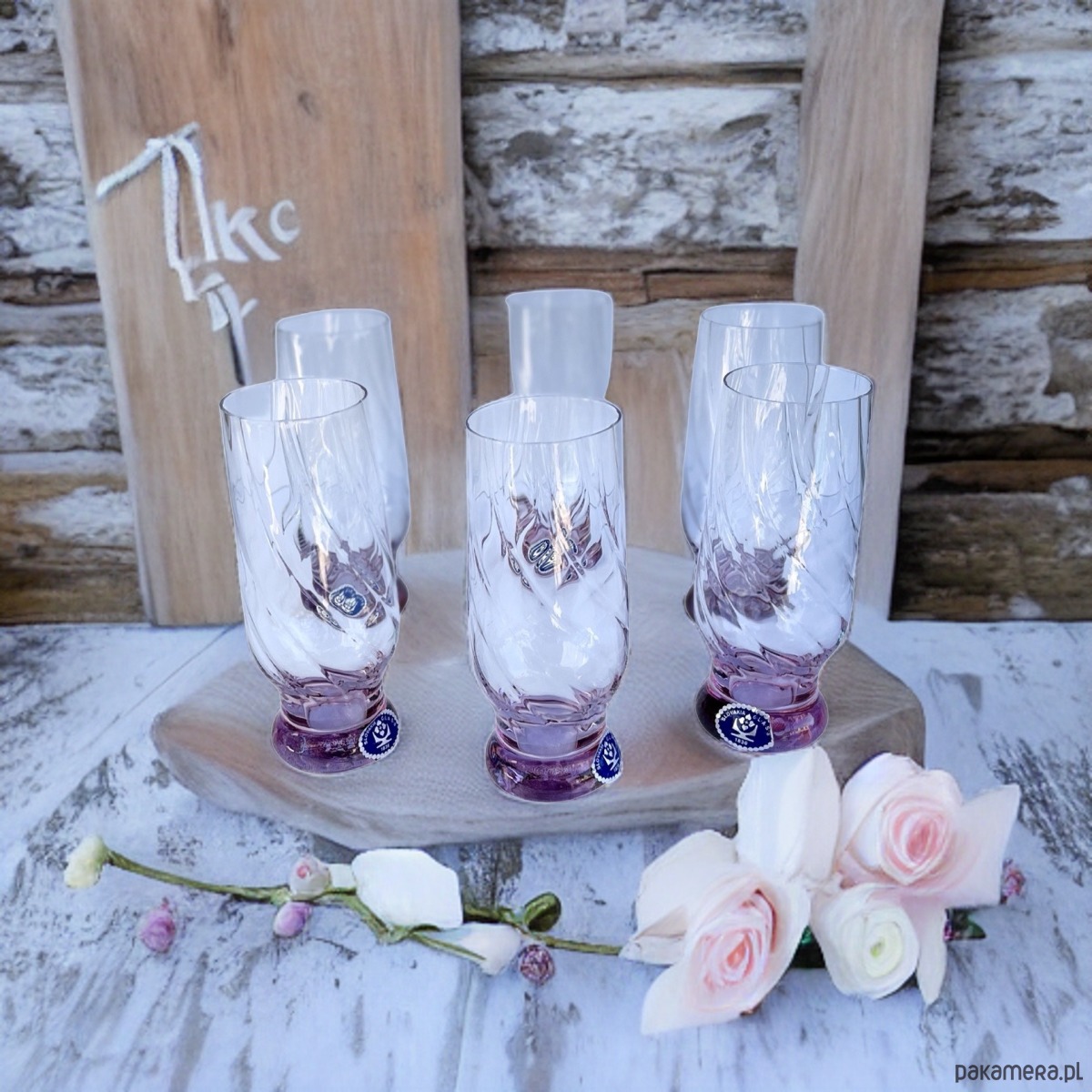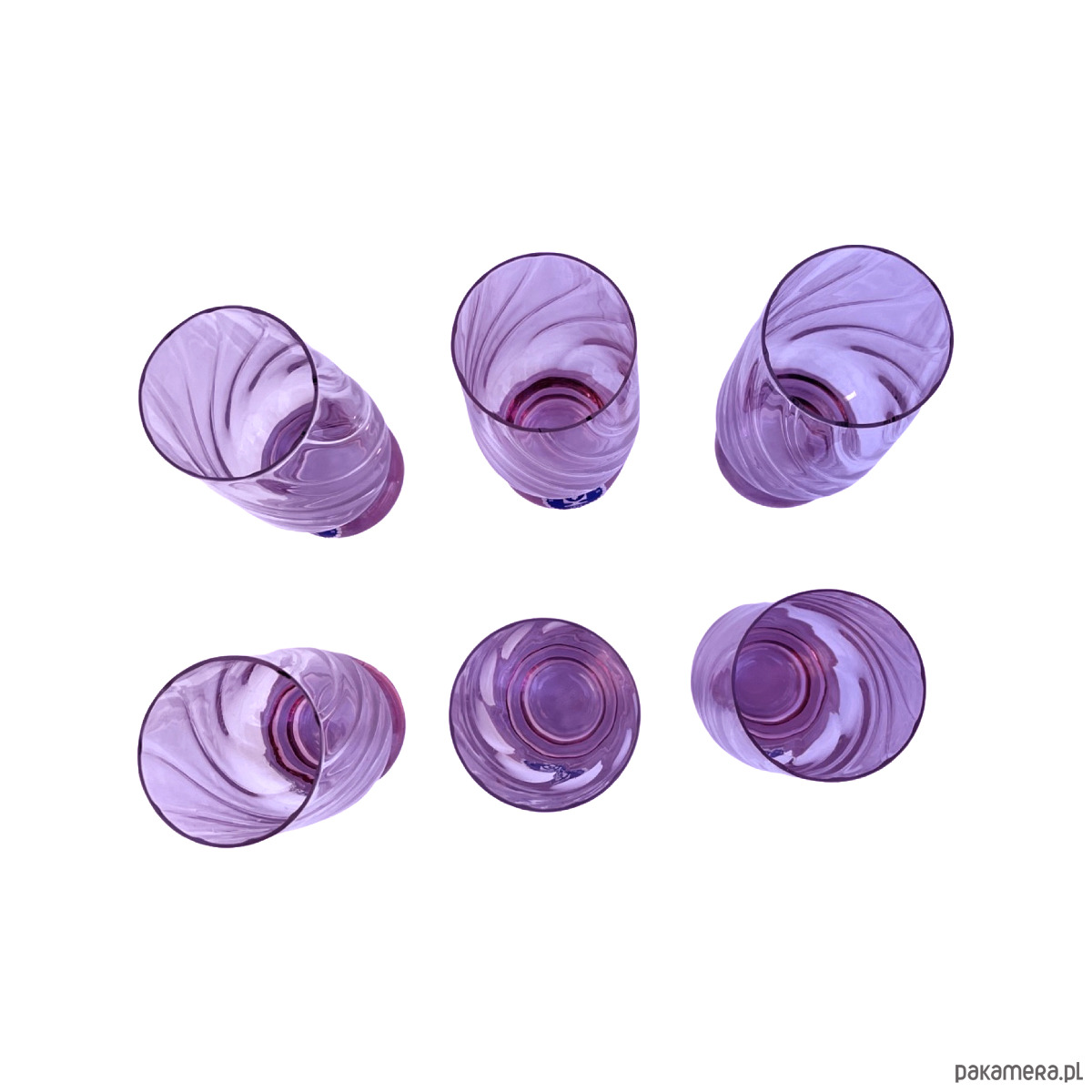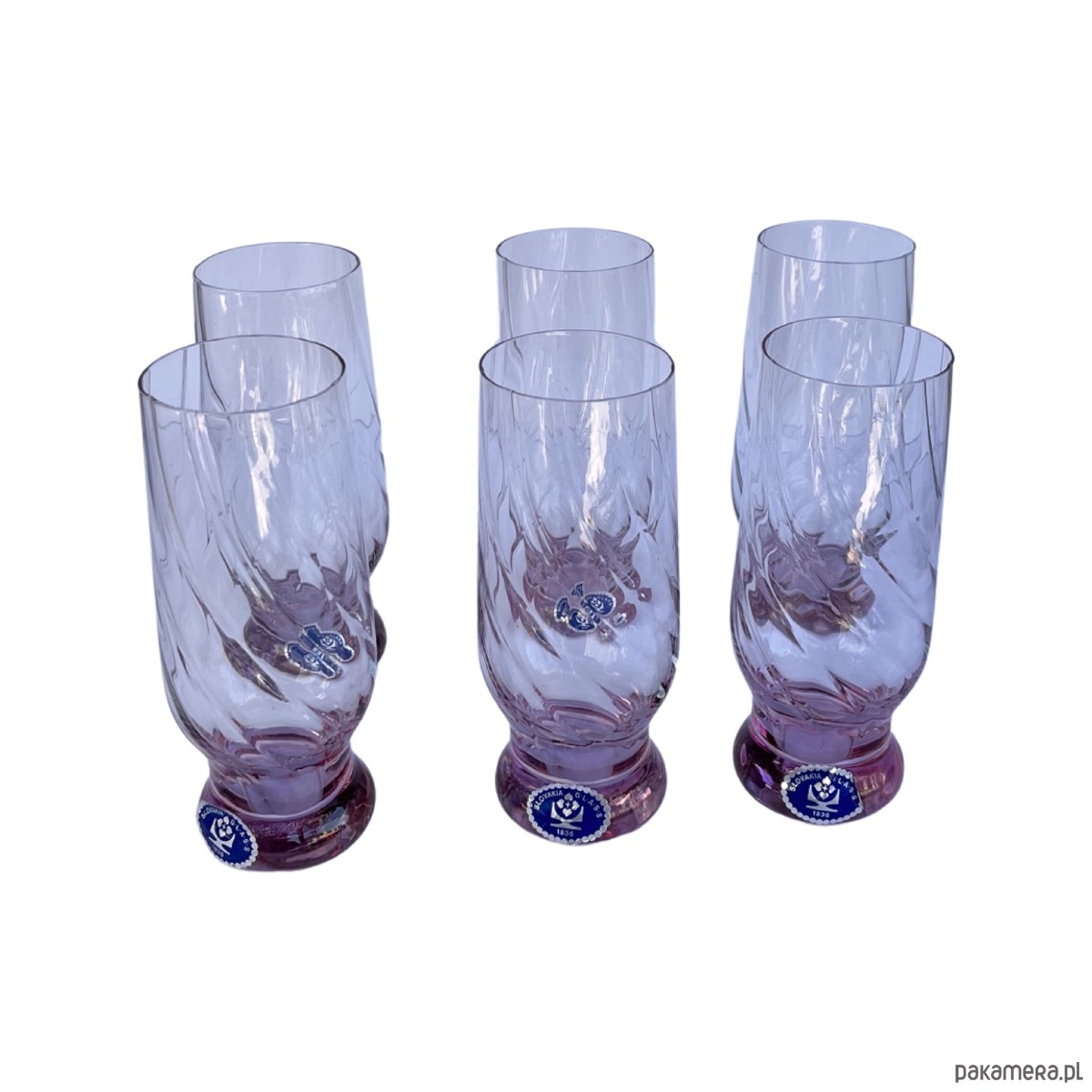 Komplet szklanek wysokoch szklanek zaprojektowanych przez Josefa Stanika wyprodukowanych w latach 1956-1989 w Słowacji przez Zlatno Sklarna. Szklanki do drinków wykonane ręcznie ze szkła neodymowego. Szklanki zachowane w stanie oryginalnym nowe nigdy nie używane. Szklanki w oryginalnym opakowaniu, z zachowanymi naklejkami producenta.