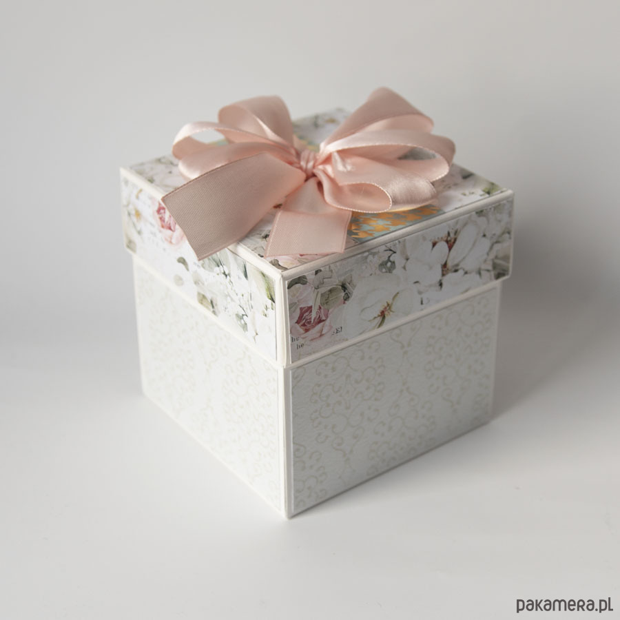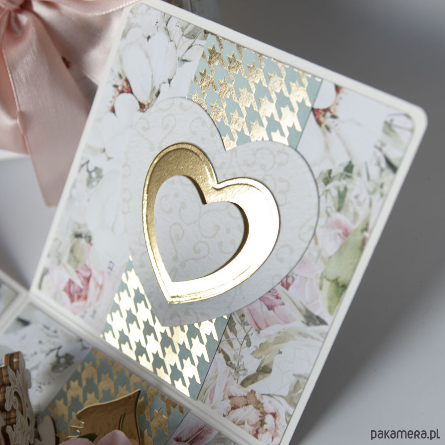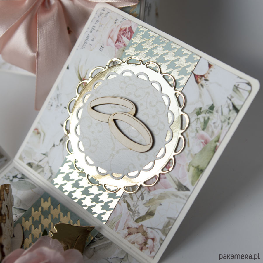 Na środku pudełeczka znajduje się dekoracja z papierowymi kwiatuszkami, na ściankach motyw serca, życzenia dla solenizantów, miejsce na podpis oraz splecione ze sobą obrączki.