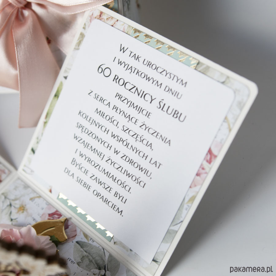 Ręcznie robiona kartka z okazji 60 rocznicy ślubu w formie rozkładanego pudełeczka.