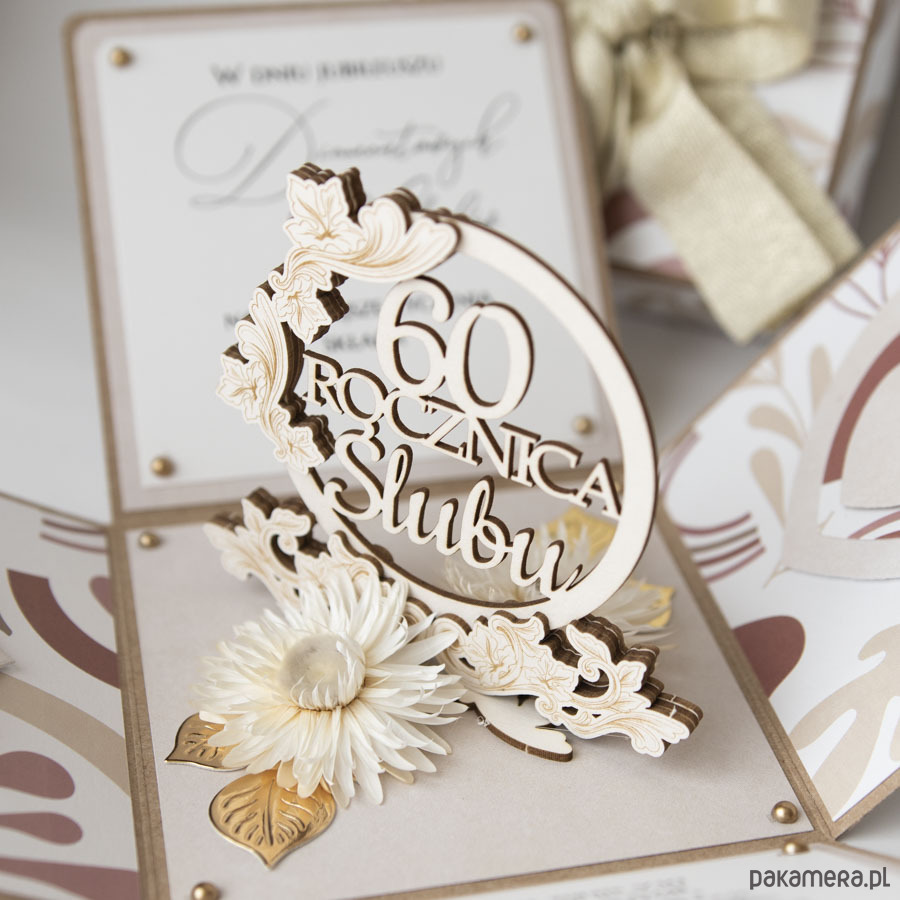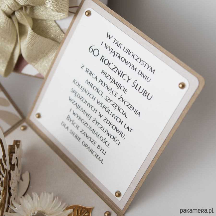Ręcznie robiona kartka z okazji 60 rocznicy ślubu w formie rozkładanego pudełeczka.