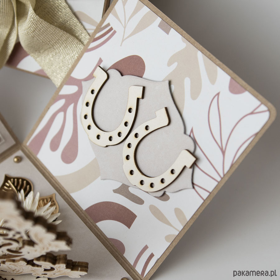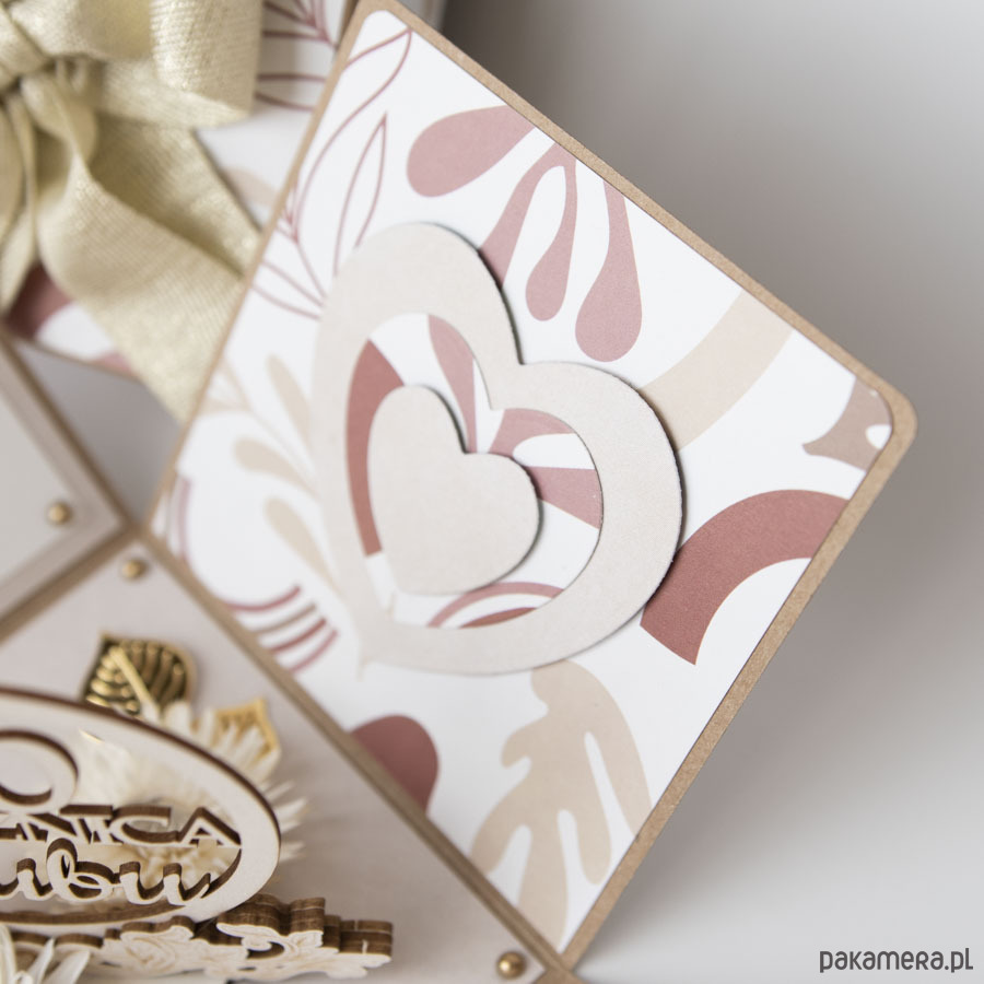 Na środku pudełeczka znajduje się dekoracja z papierowymi kwiatuszkami, na ściankach motyw serca, życzenia dla solenizantów, miejsce na podpis oraz dwie podkowy na szczęście.