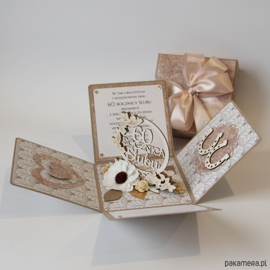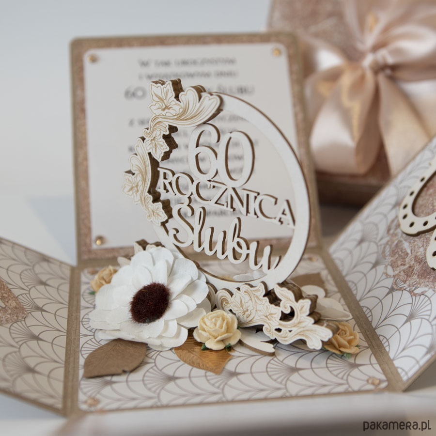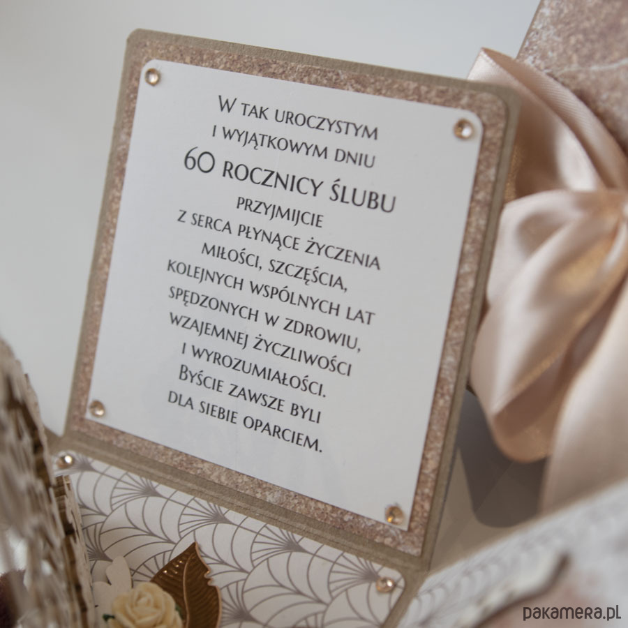 Ręcznie robiona kartka z okazji 60 rocznicy ślubu w formie rozkładanego pudełeczka.