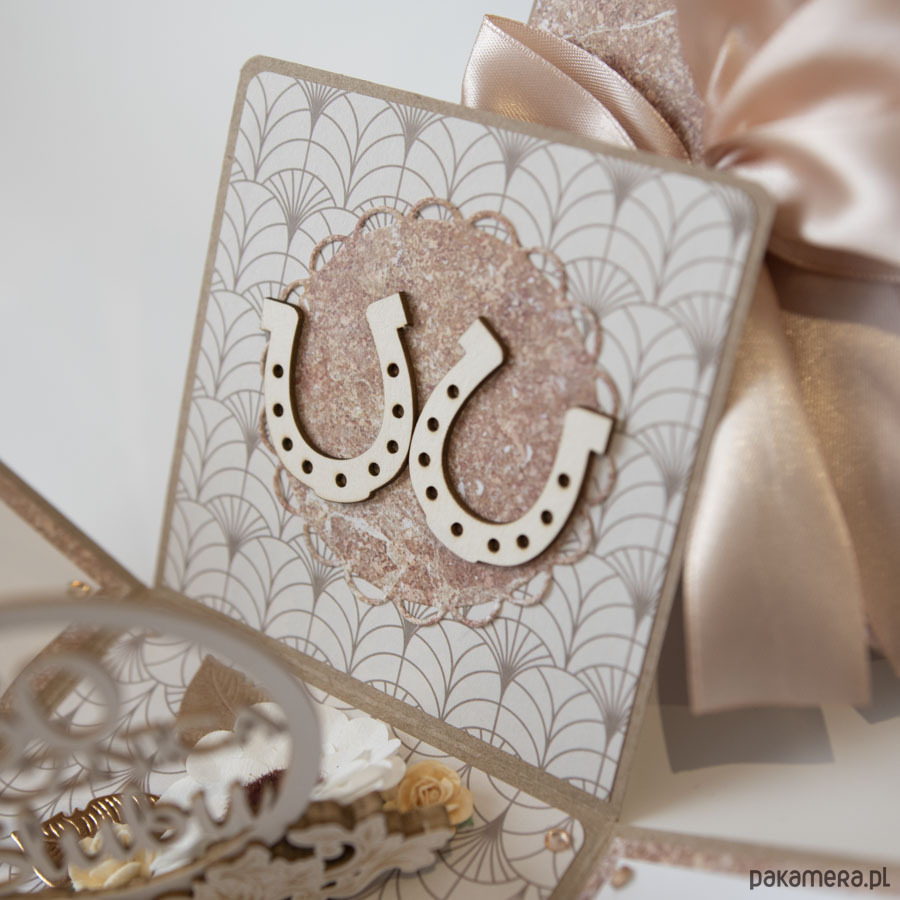 Na środku pudełeczka znajduje się dekoracja z papierowymi kwiatuszkami, na ściankach motyw serca, życzenia dla solenizantów, miejsce na podpis oraz podkowy na szczęście.