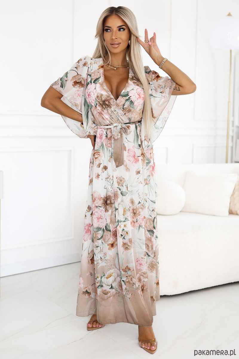 Zjawiskowa sukienka maxi z delikatnego szyfonu na podszewce to idealny wybór na wyjątkowe okazje. Kwiatowy wzór w pastelowych odcieniach beżu, różu i zieleni dodaje subtelności i kobiecego wdzięku. Góra z kopertowym dekoltem pięknie eksponuje biust, a rozkloszowany fason zapewnia komfort i swobodę ruchów. Rękawy typu motyl oraz ozdobne wiązanie z tyłu na plecach dodają całości lekkości i romantyzmu. Gumka w pasie dopasowuje się do sylwetki, podkreślając talię. Marka Numoco Basic – produkcja europejska.