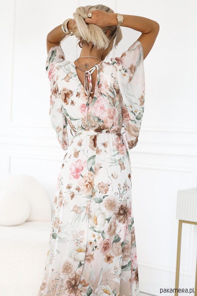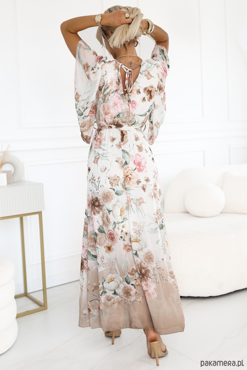 Elegancka sukienka maxi z motywem kwiatowym w odcieniach beżu i różu