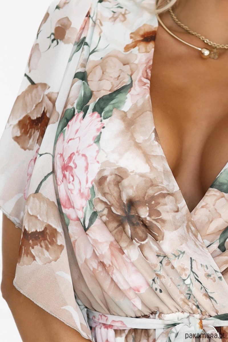 603-2 Zwiewna sukienka z kopertowym dekoltem i kwiecistym wzorem