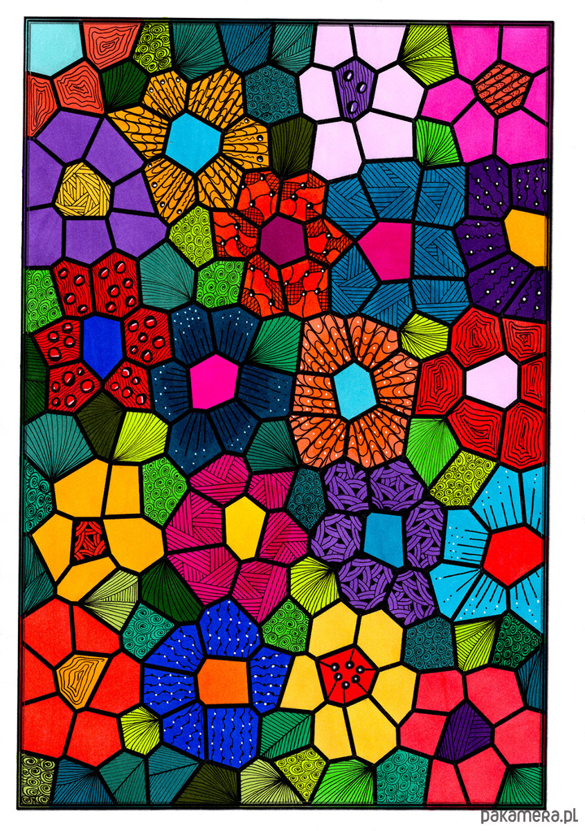 Rysunek charakteryzuje się eksplozją nasyconych kolorów i kontrastującymi fakturami, gdzie każda sekcja jest wypełniona innym wzorem liniowym lub kropkowym (Zentangle inspired), tworząc wrażenie wibrującej i złożonej struktury.