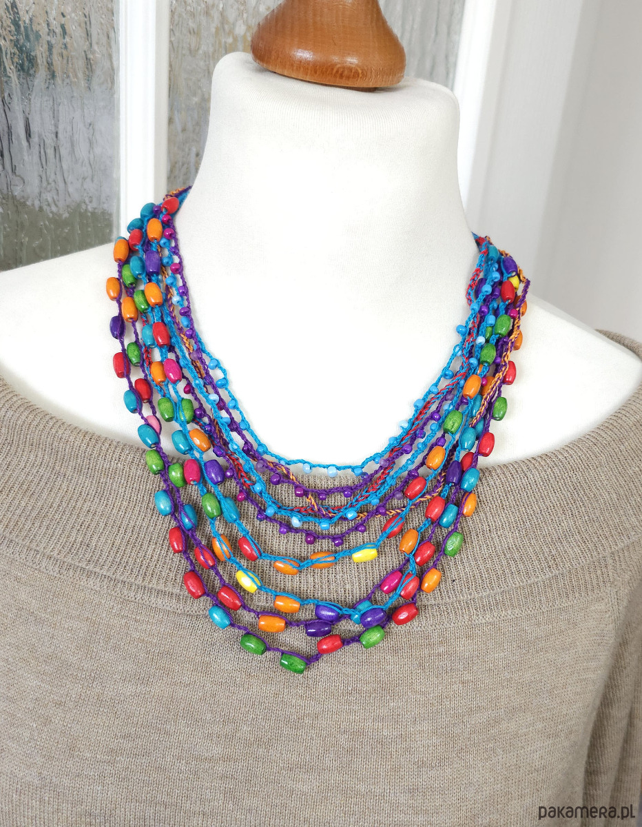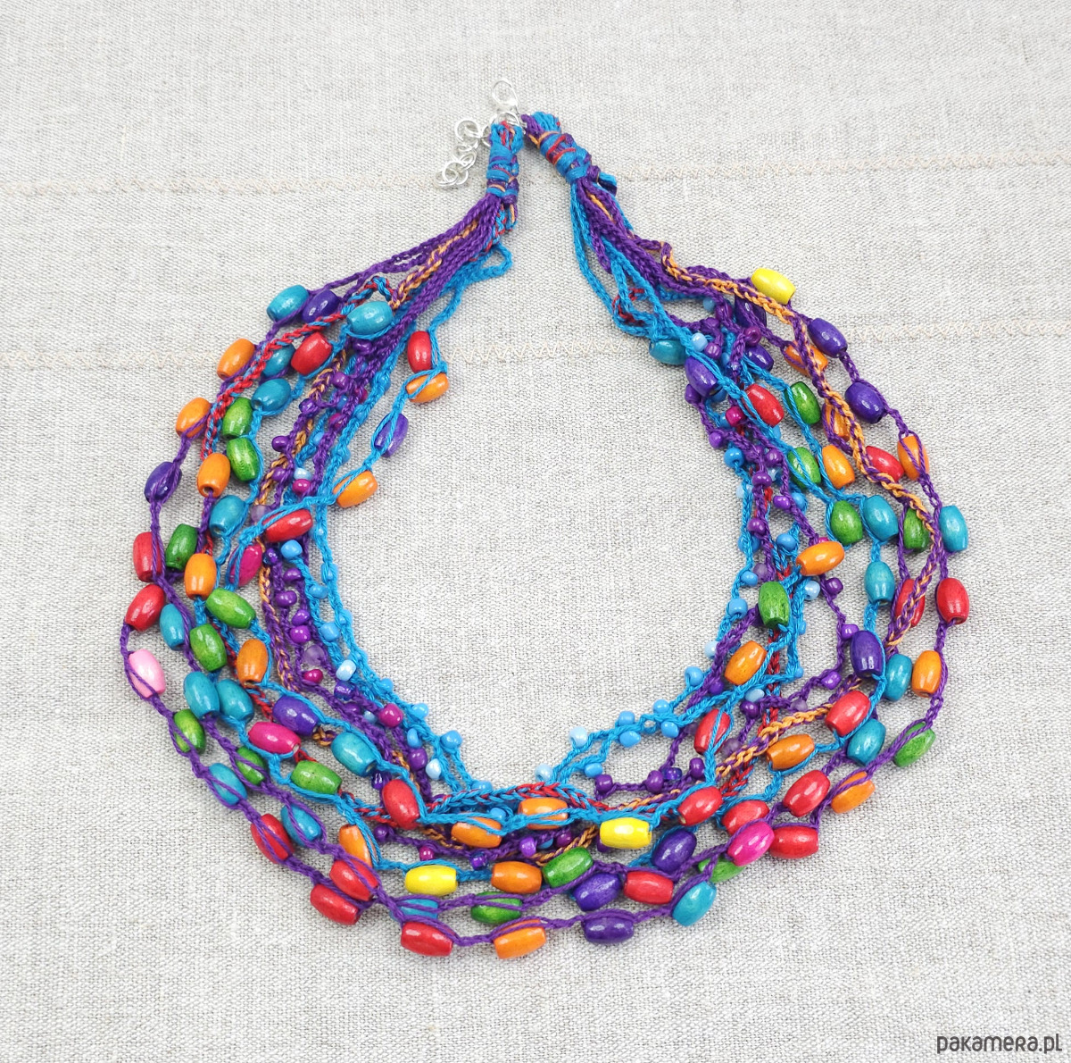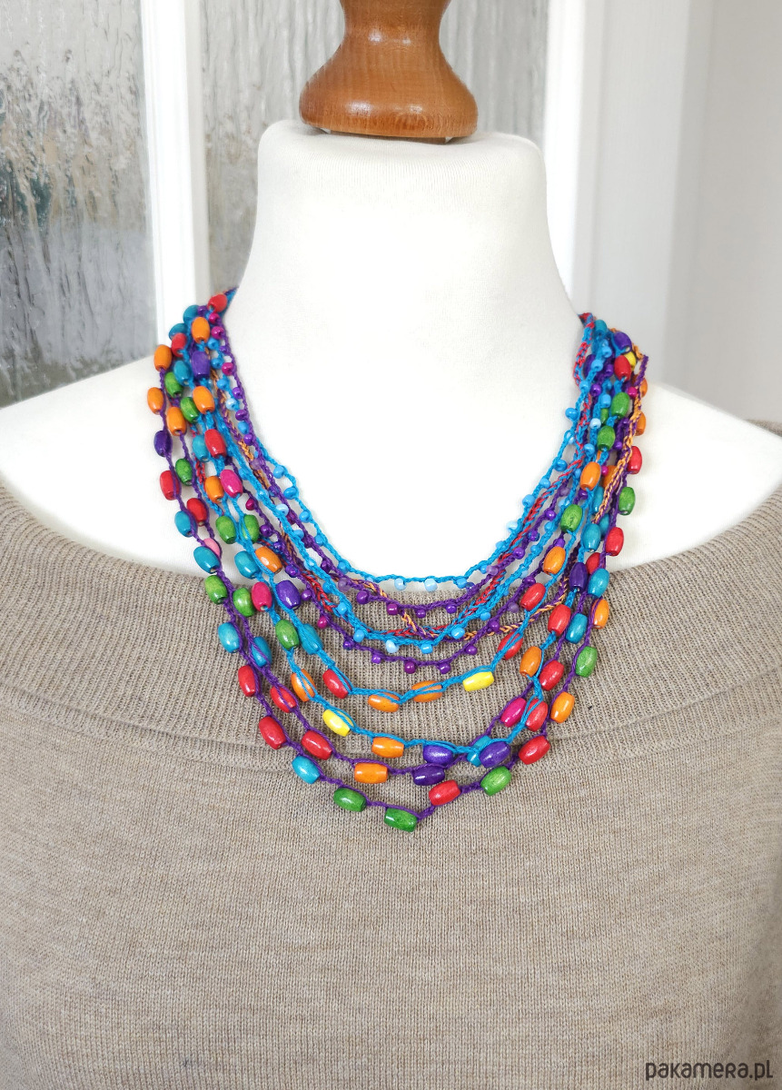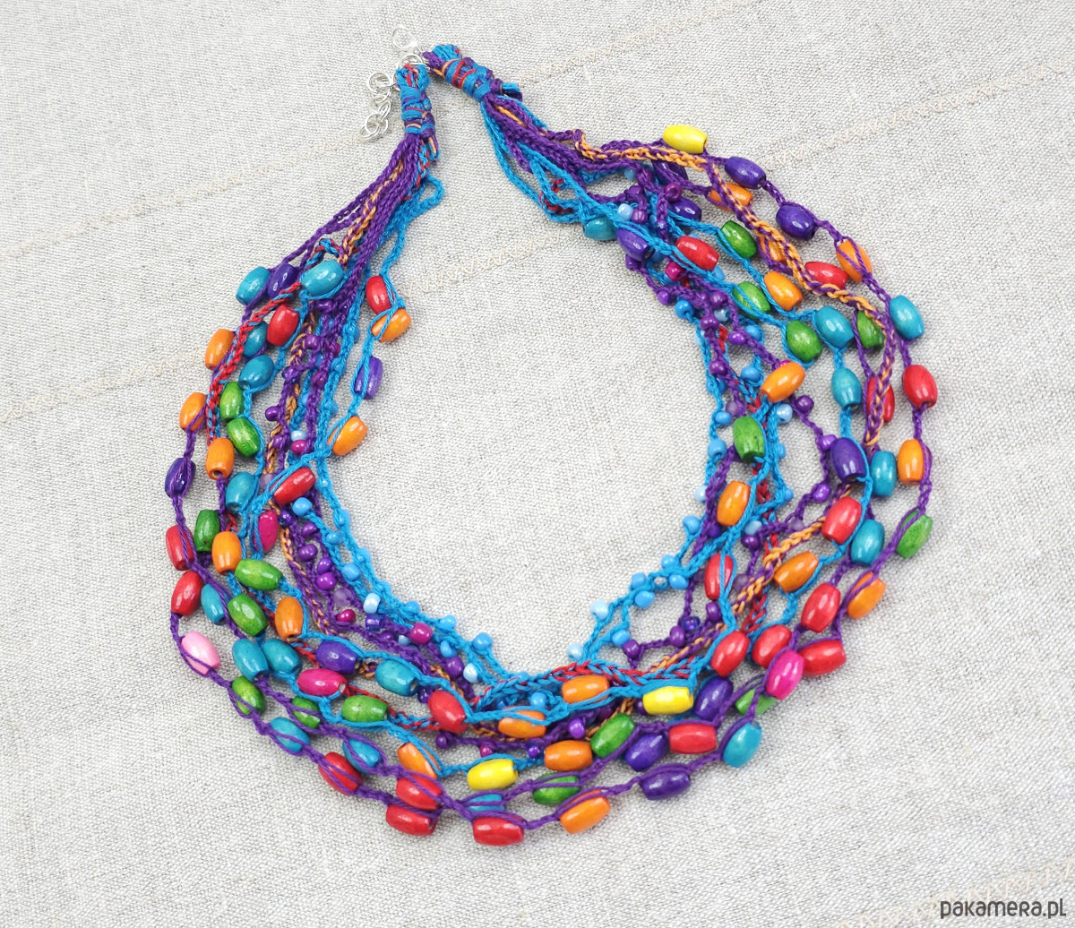 Naszyjnik składa się z dziesięciu sznurków, na których przeplatają się różnokolorowe, szklane i drewniane koraliki.