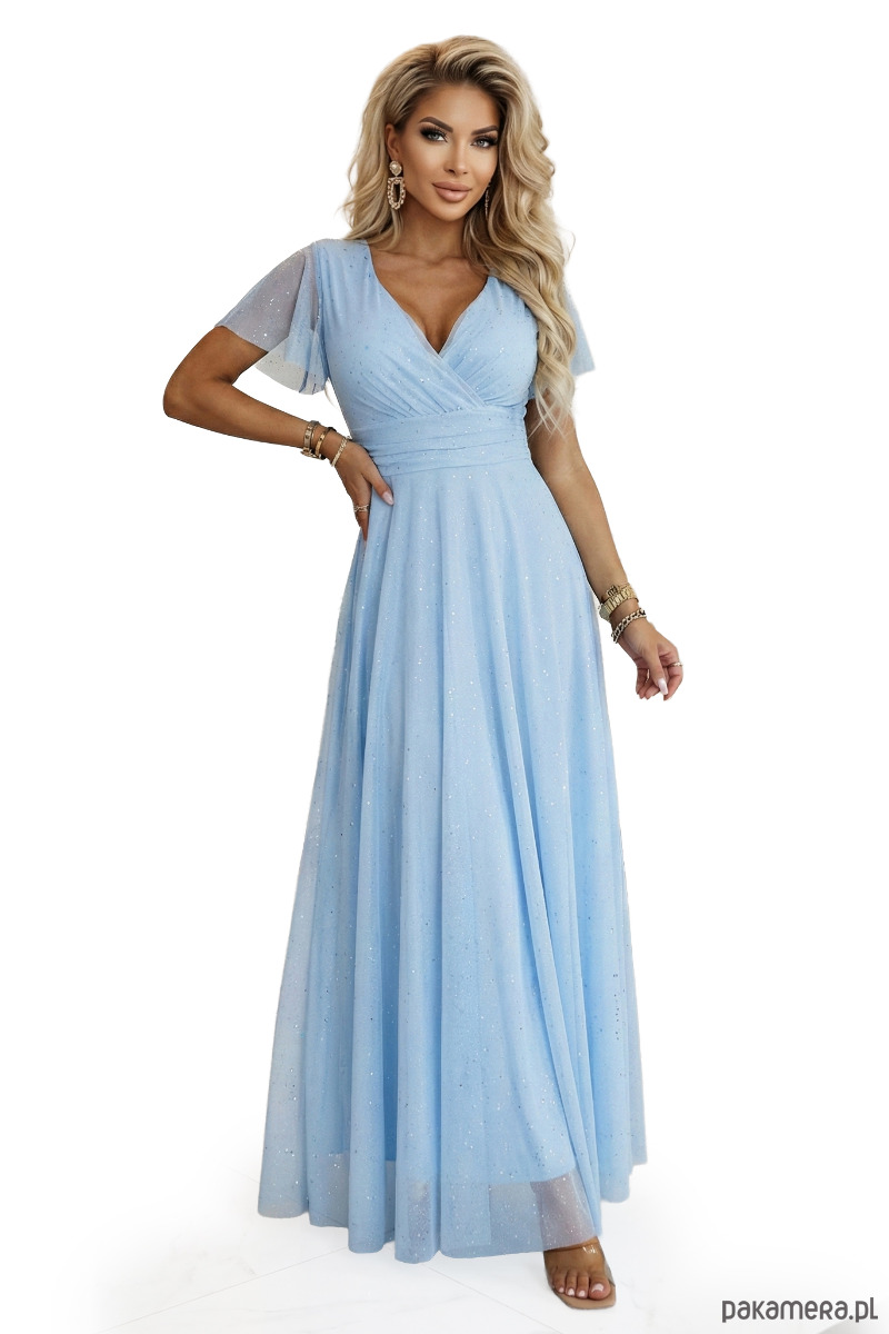 Ta błękitna sukienka maxi to szybki sposób na efekt „wow” bez przekombinowania. Kopertowy dekolt pięknie podkreśla biust, a zaznaczona talia modeluje sylwetkę i dodaje lekkości w ruchu. Subtelne drobinki połysku sprawiają, że wyglądasz świeżo i elegancko - od pierwszego kroku na salę.