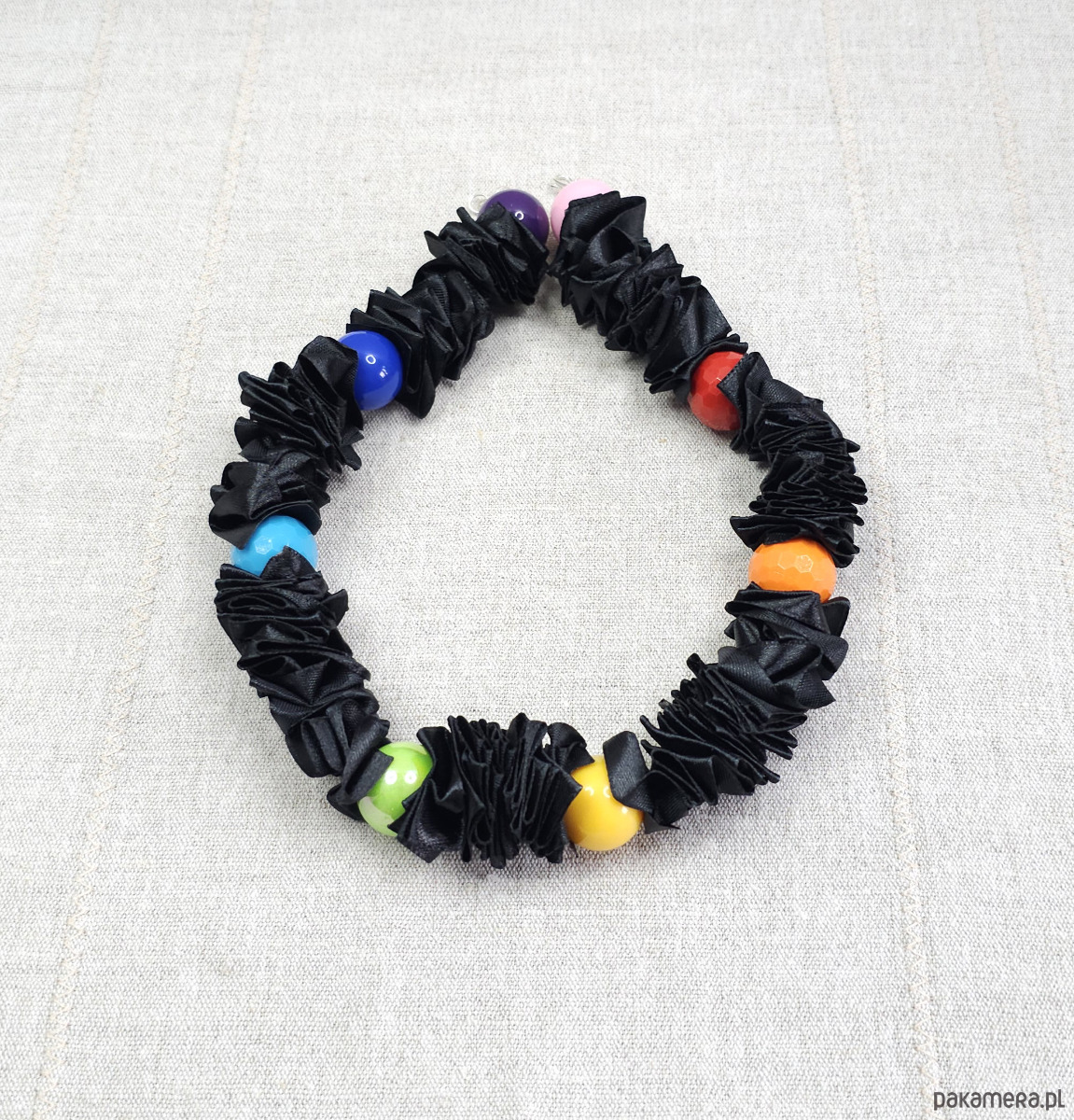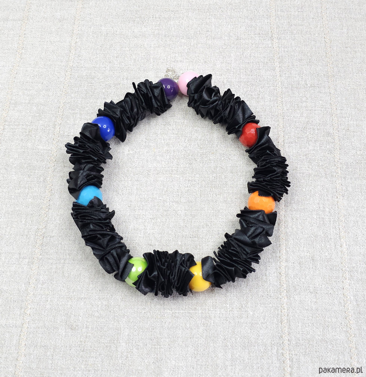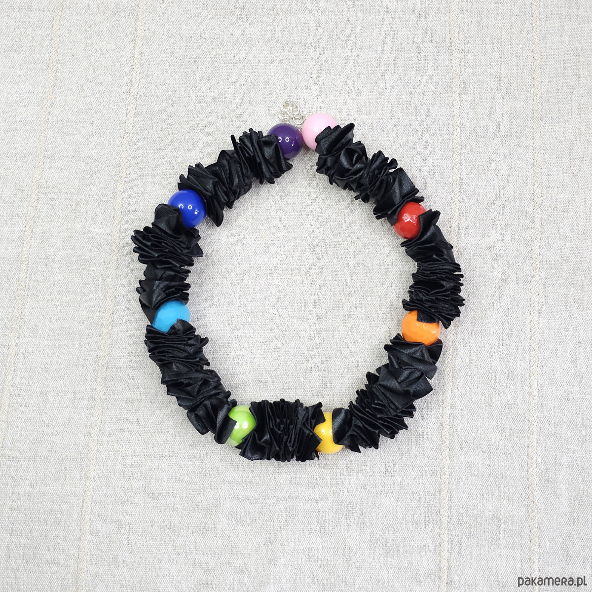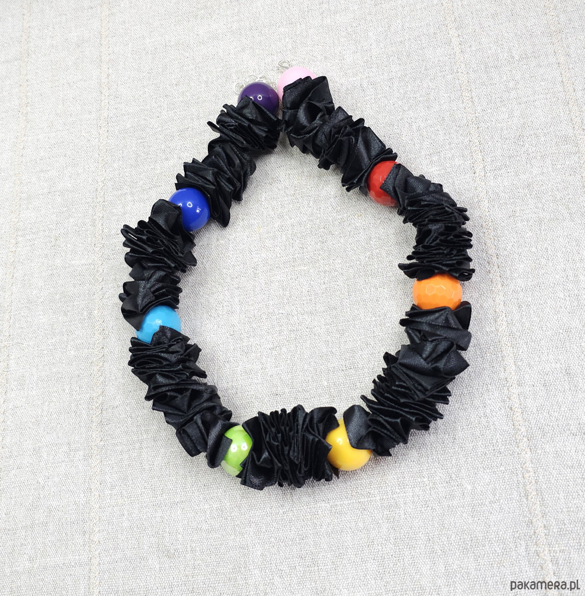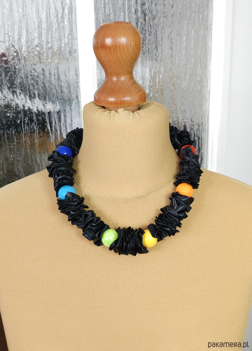 Został wykonany z czarnej, marszczonej satyny, która tworzy bogatą, teksturowaną bazę. Na tym tle wspaniale wyróżniają się gładkie, kolorowe kulki akrylowe o średnicy 20 mm, które przyciągają wzrok i dodają energii.