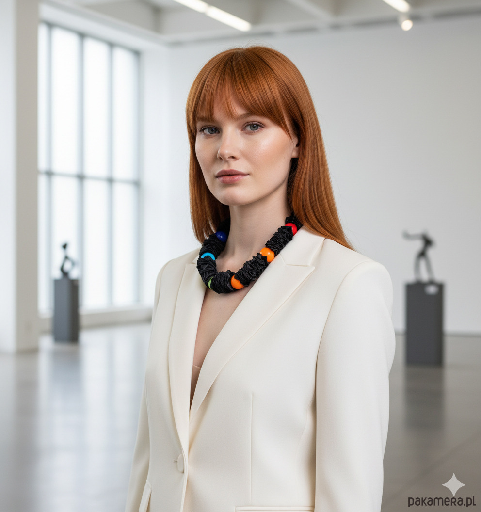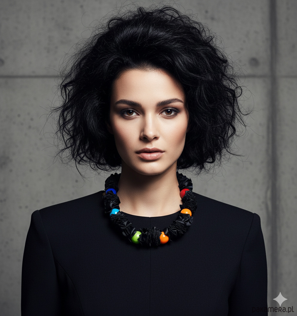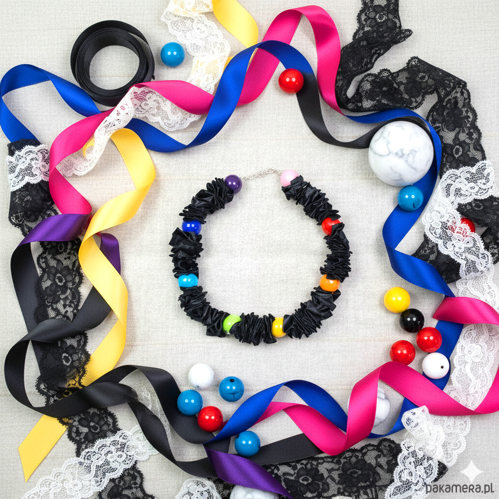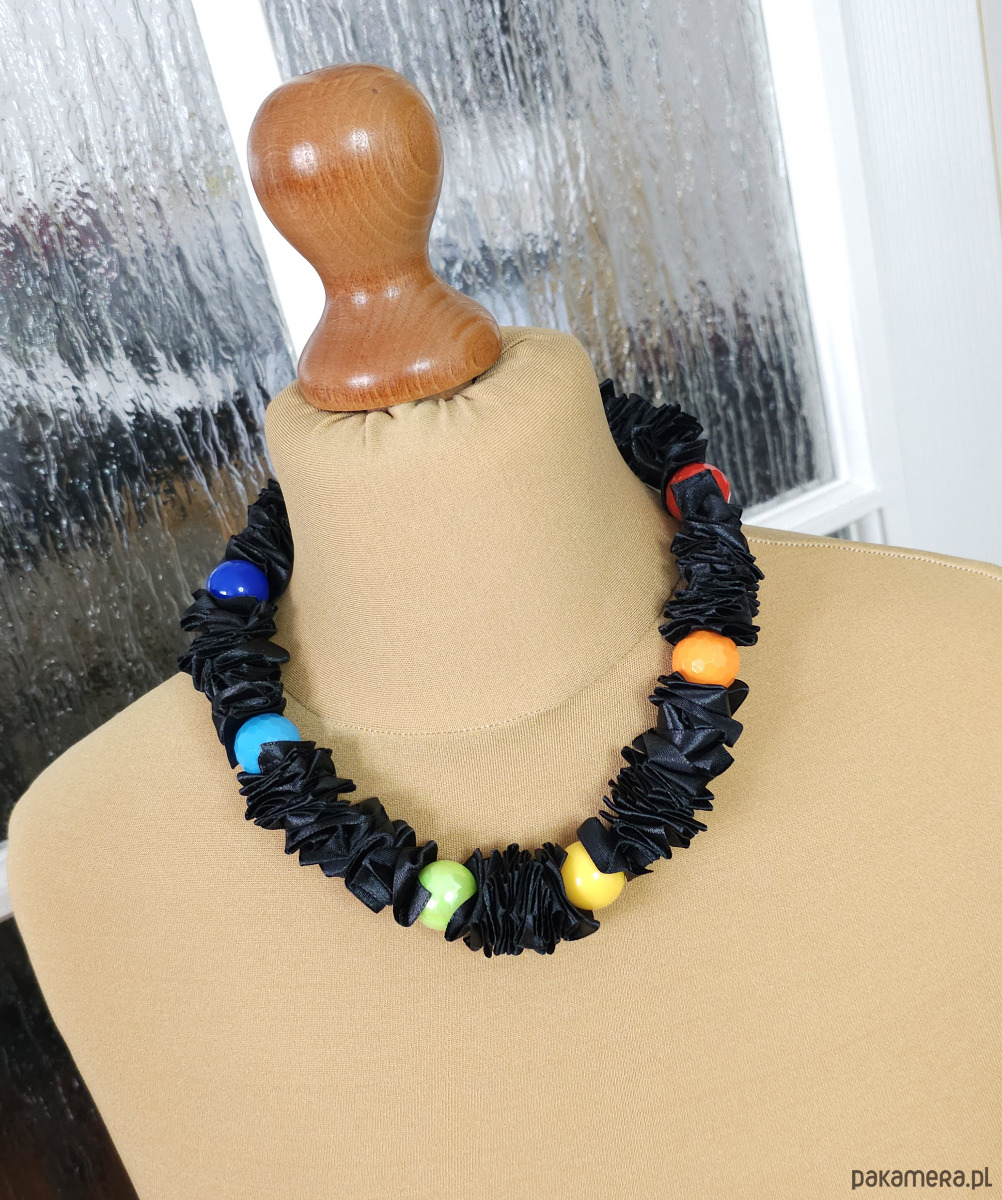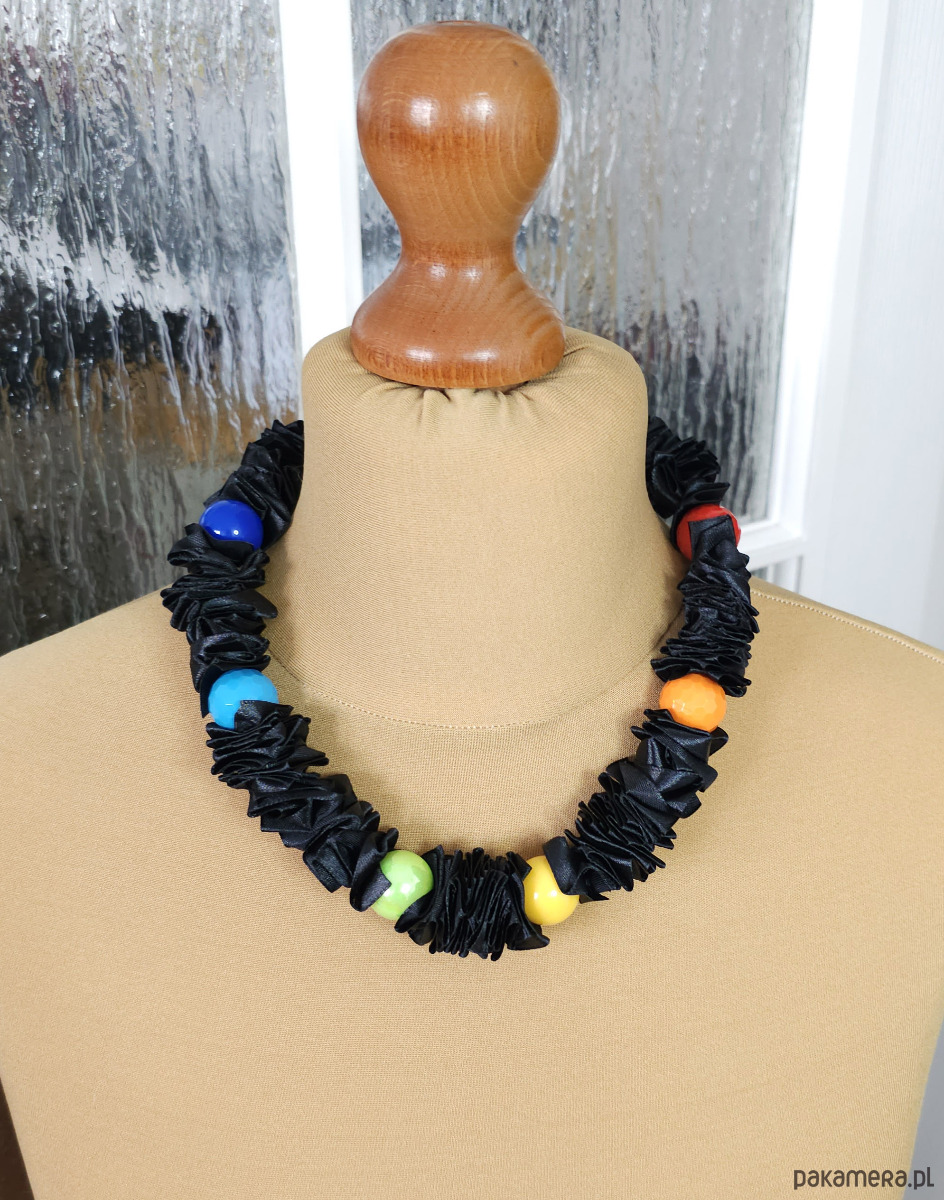 Został wykonany z czarnej, marszczonej satyny, która tworzy bogatą, teksturowaną bazę. Na tym tle wspaniale wyróżniają się gładkie, kolorowe kulki akrylowe o średnicy 20 mm, które przyciągają wzrok i dodają energii.