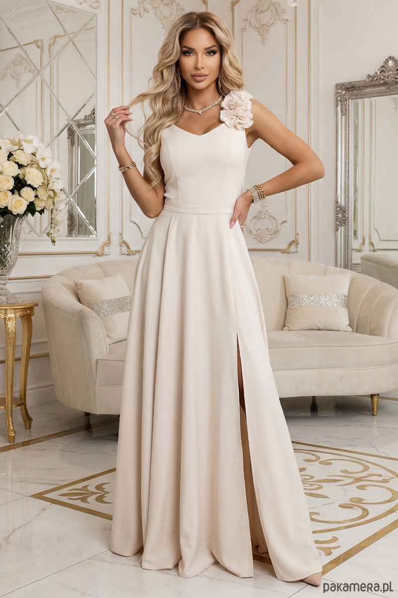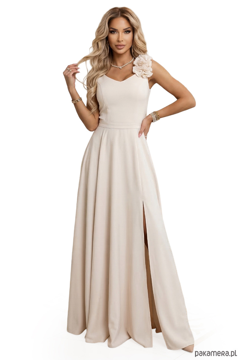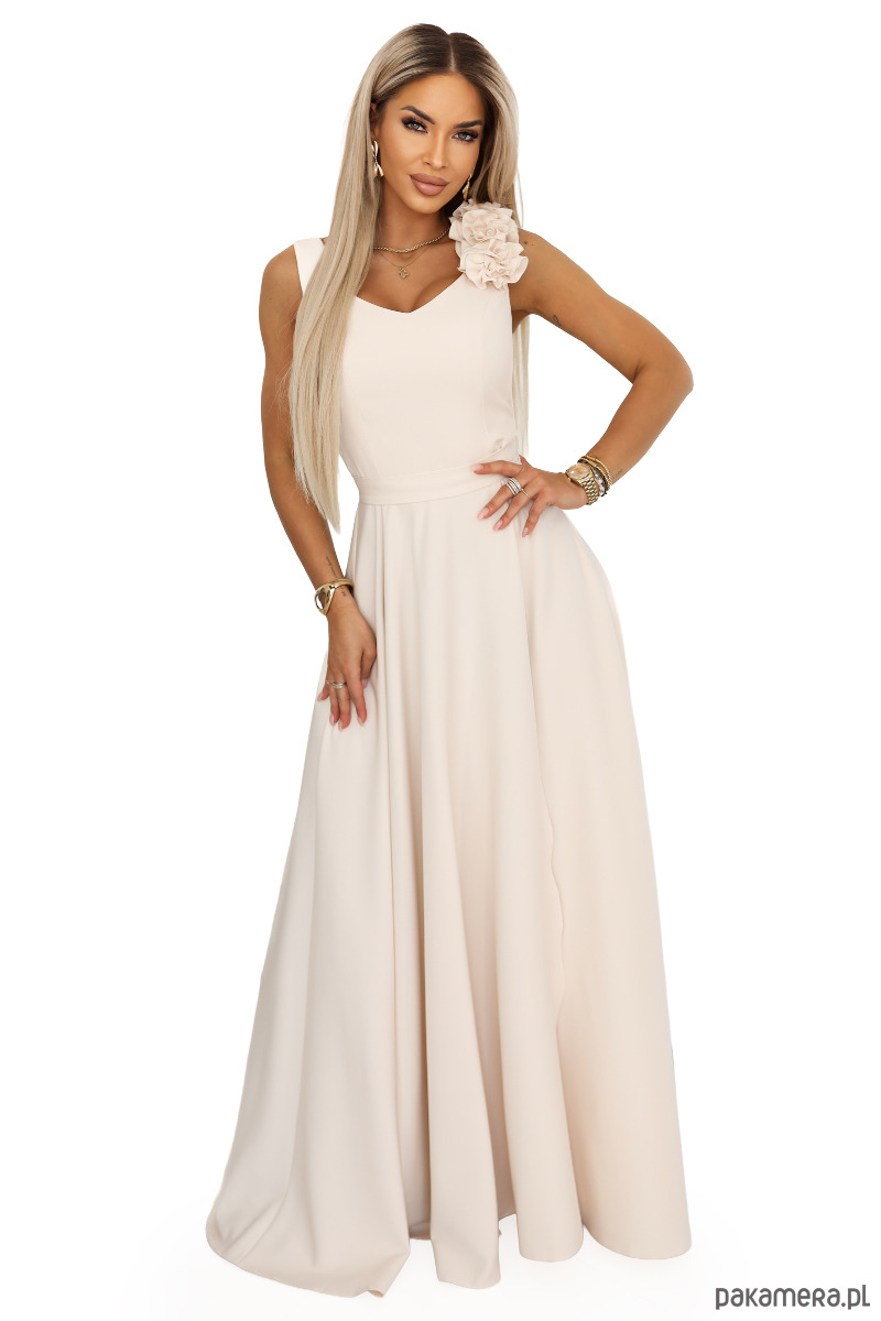 Beżowa sukienka maxi Numoco z kwiatem na ramieniu - elegancja na wesele i wyjątkowe okazje