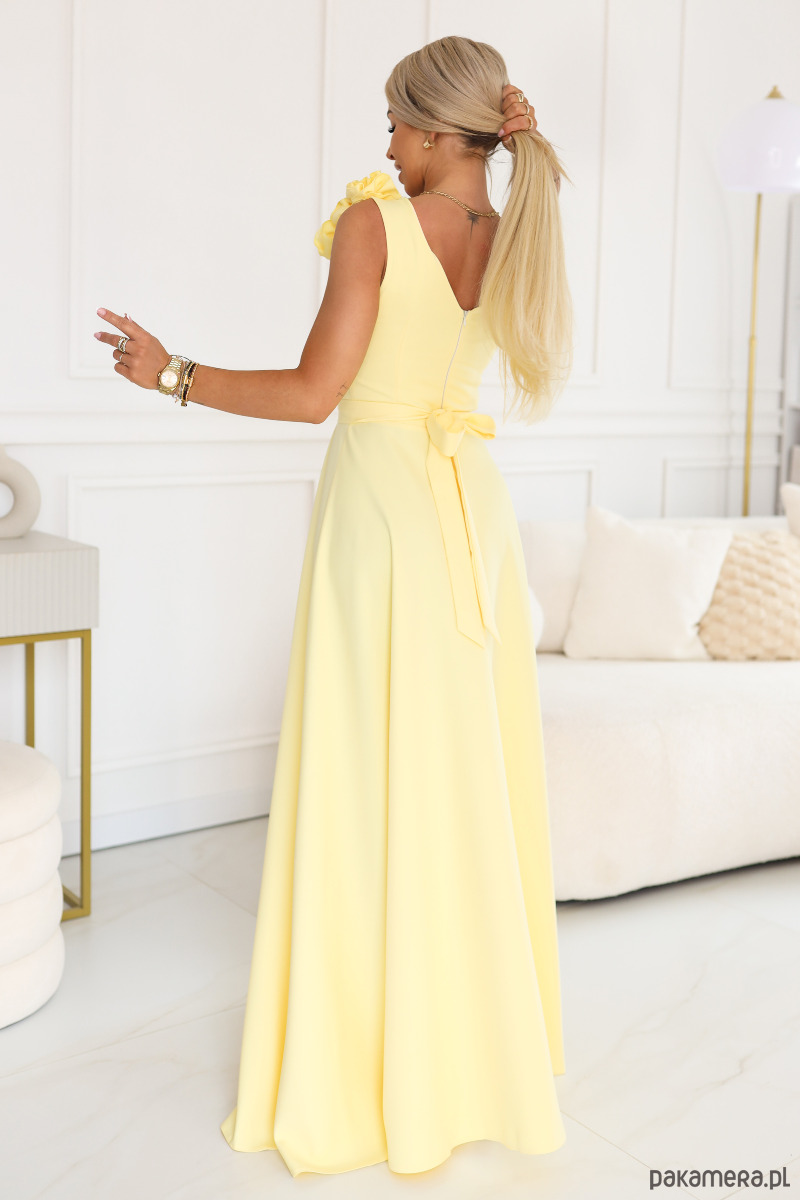 643-5 Elegancka wieczorowa suknia maxi z rozcięciem i różami - żółta