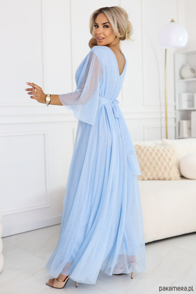 Błękitna długa sukienka plus size z delikatnym połyskiem — elegancka propozycja na uroczyste okazje. Uszyta z lekkiego tiulu z subtelnym brokatowym efektem, wykończona miękką podszewką, zapewnia komfort i swobodę ruchu przez cały wieczór. Fason maxi z kopertowym dekoltem w kształcie litery V oraz odcinaną talią optycznie wysmukla sylwetkę. Szeroki pas w talii i praktyczne wiązanie z tyłu umożliwiają precyzyjne dopasowanie obwodu. Rękawy 3/4 wykonane z półtransparentnej siateczki dodają lekkości i subtelnej zmysłowości. Długa, zwiewna spódnica z warstwą tiulu na wierzchu pięknie układa się podczas ruchu i świetnie prezentuje na zdjęciach.