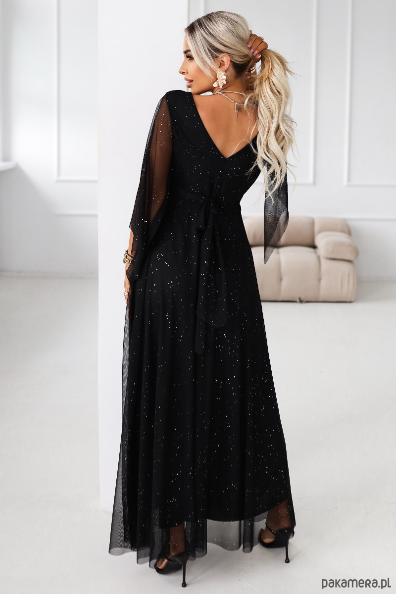 655-1 Długa połyskująca w świetle suknia z dekoltem i transparentnym rękawkiem - czarna - UNI