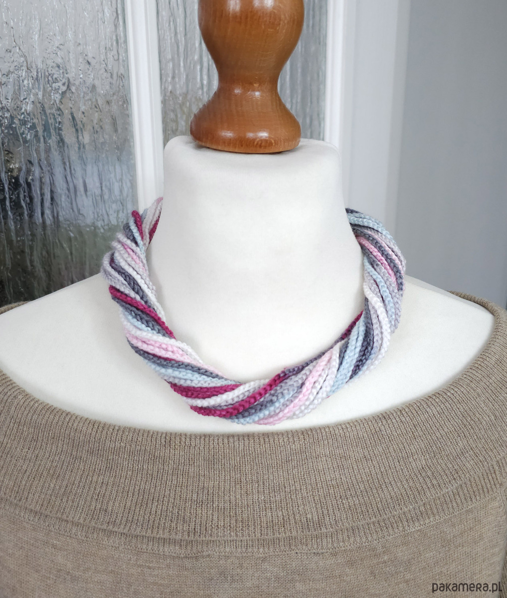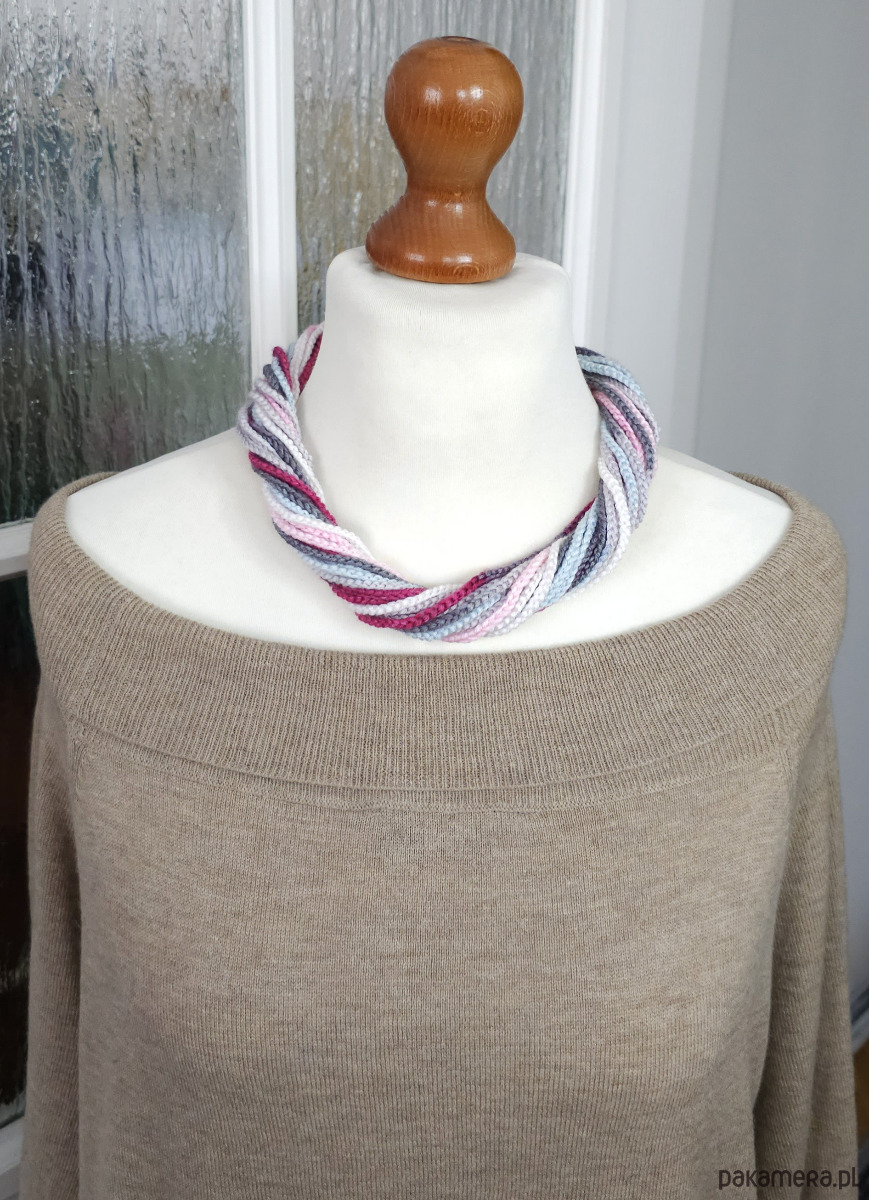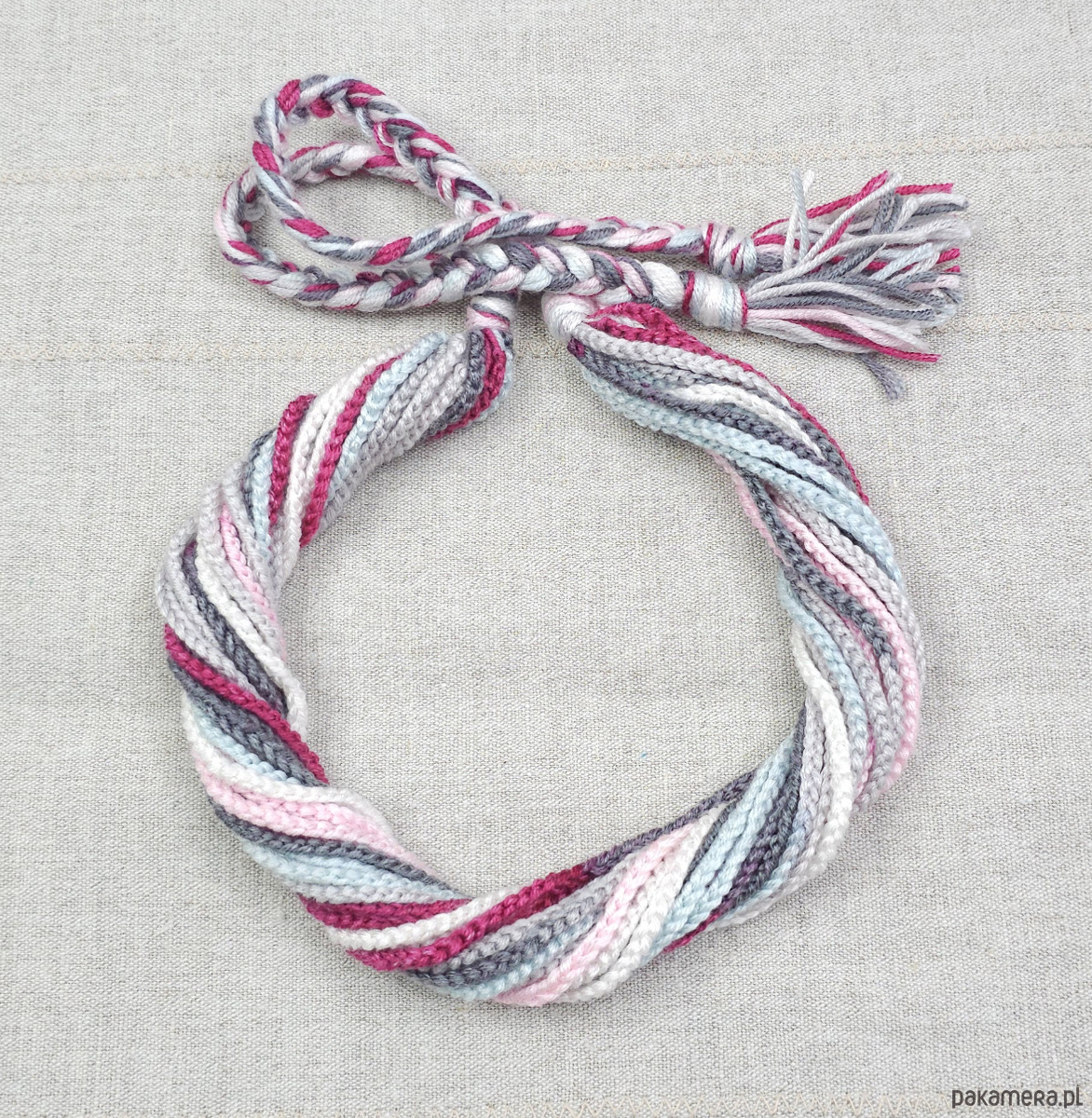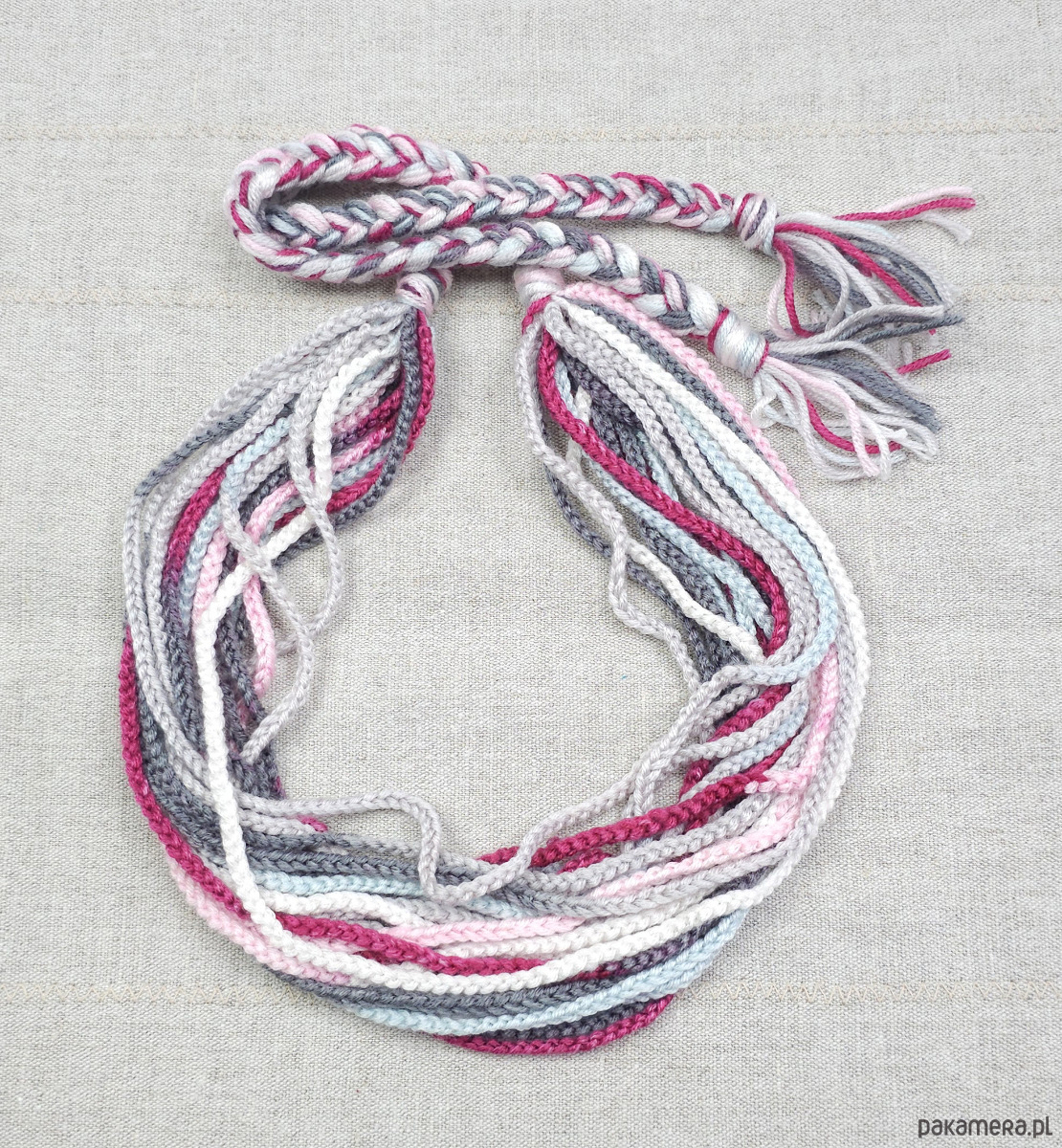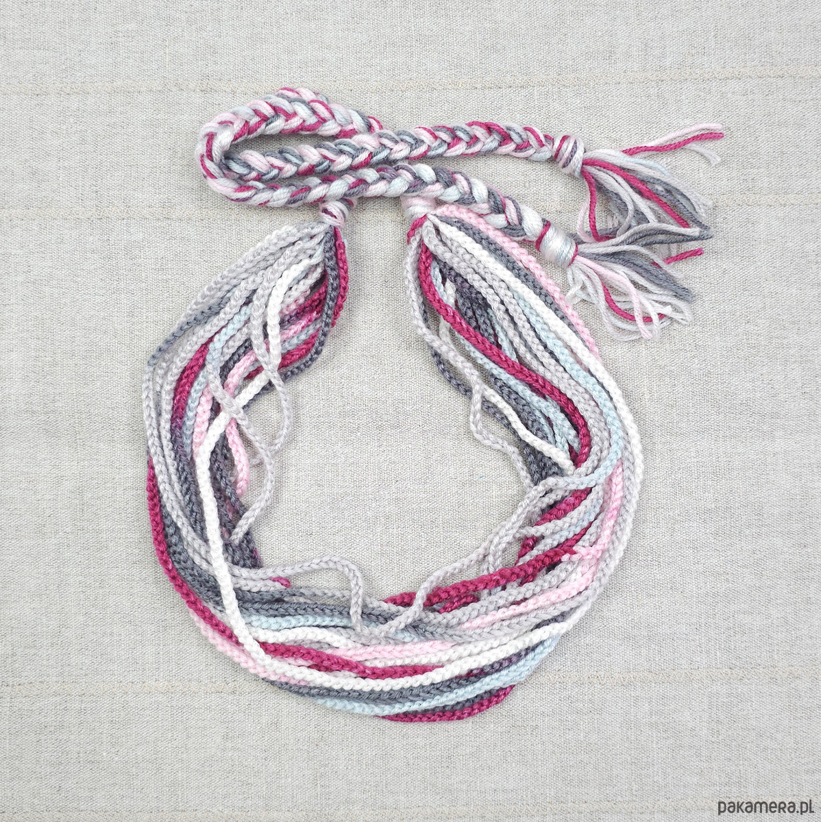 Naszyjnik wykonany z 21 szt. ręcznie plecionych sznurków .