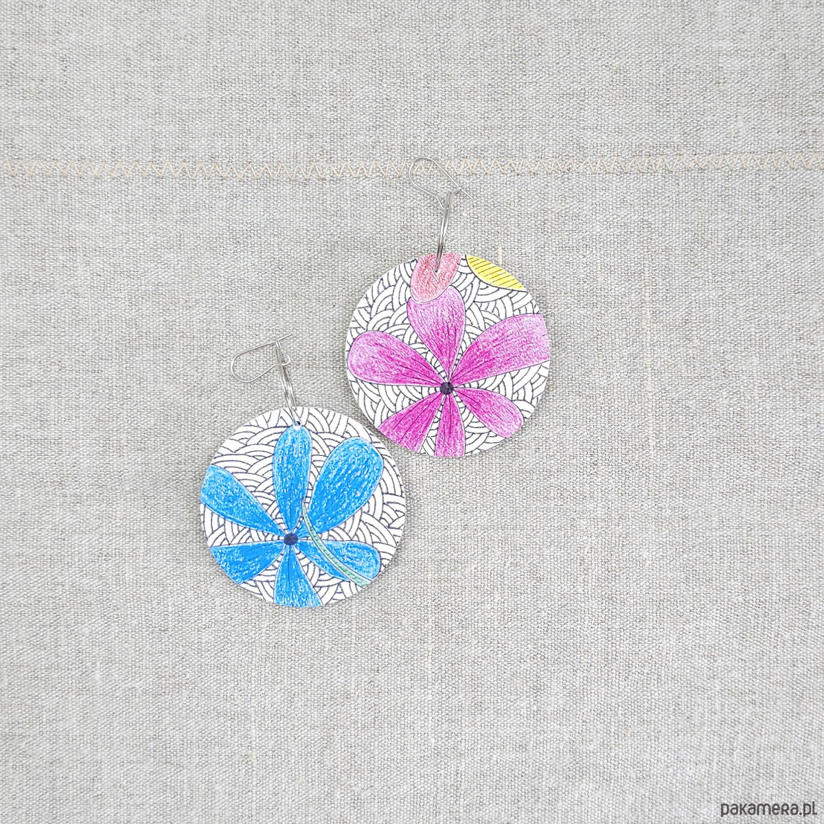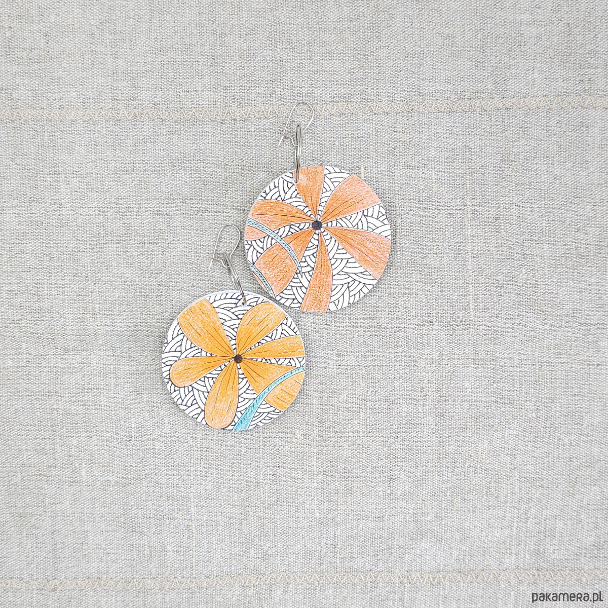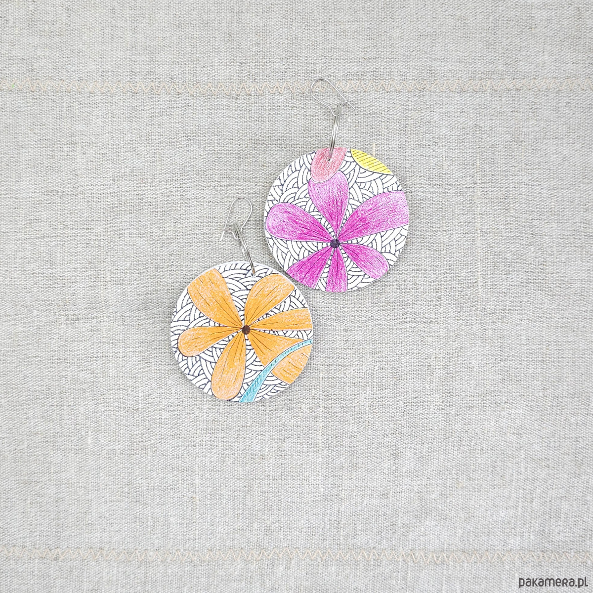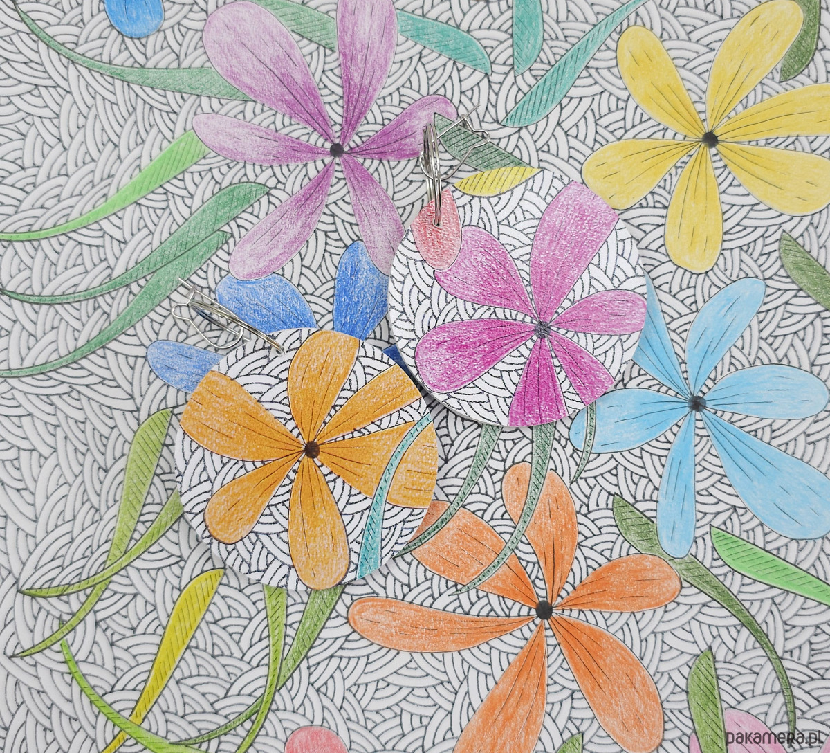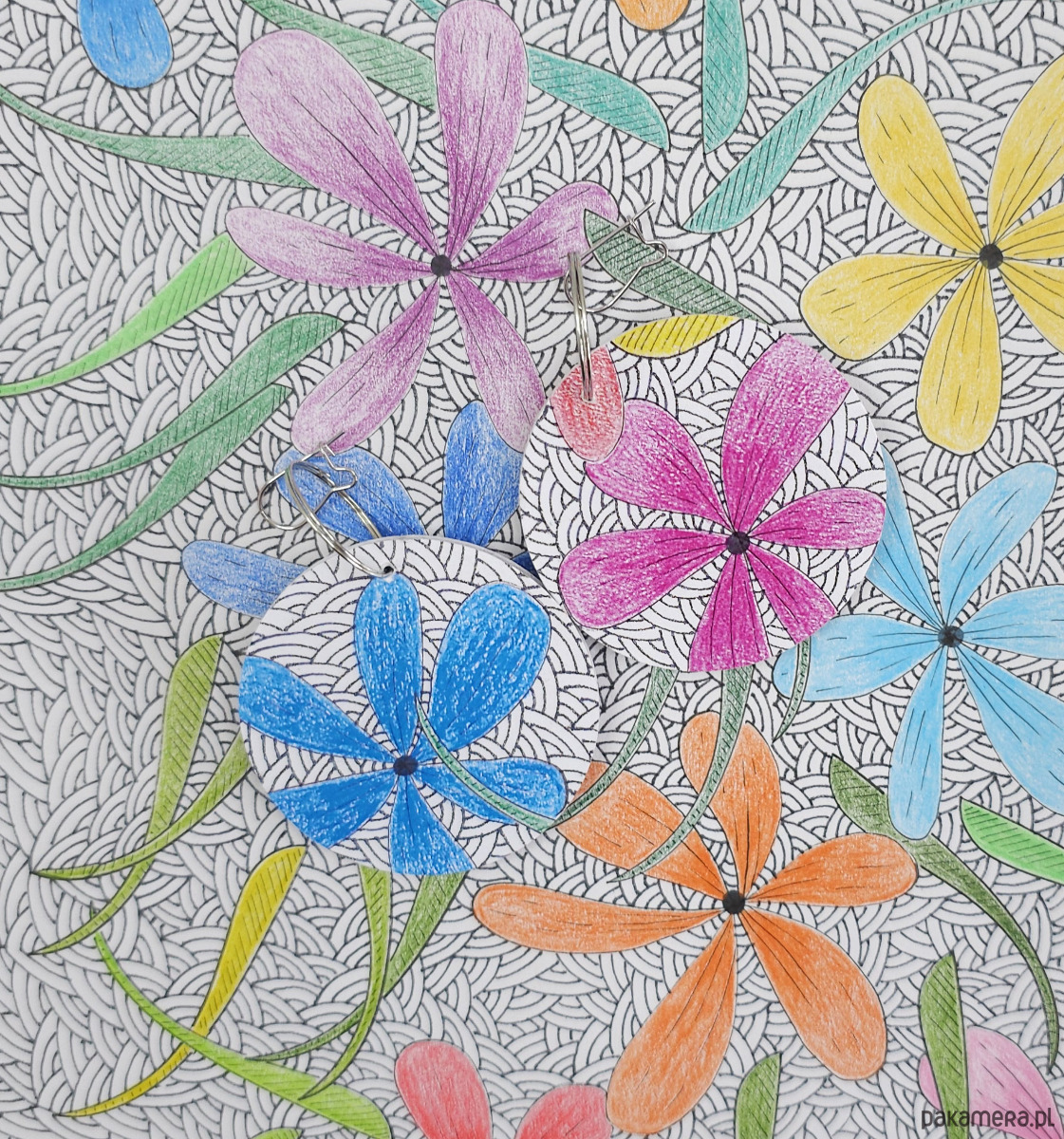 Kolczyki wykonane z drewnianej bazy oraz części mojego autorskiego rysunku "Kwiaty".