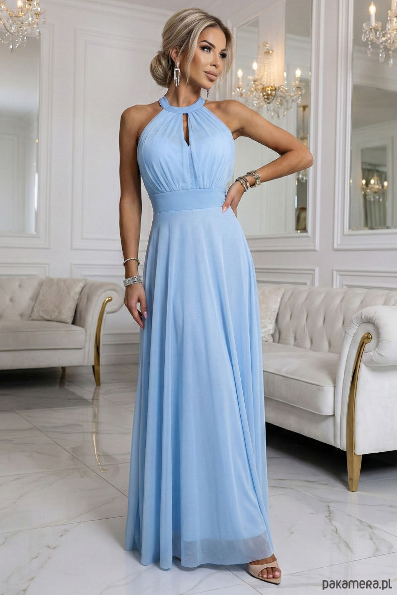 662-1 Elegancka sukienka wieczorowa maxi halter z tiulem - błękitna