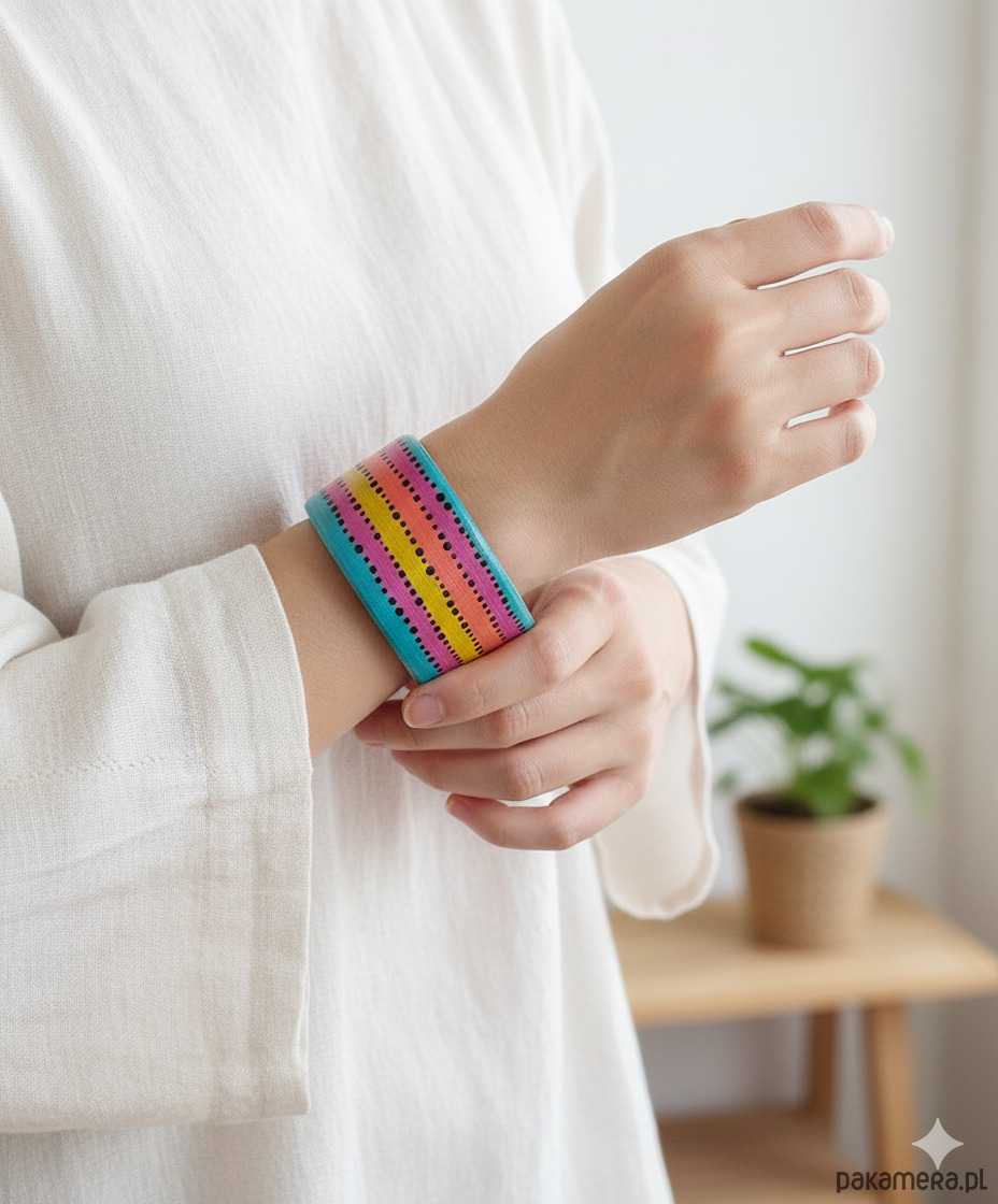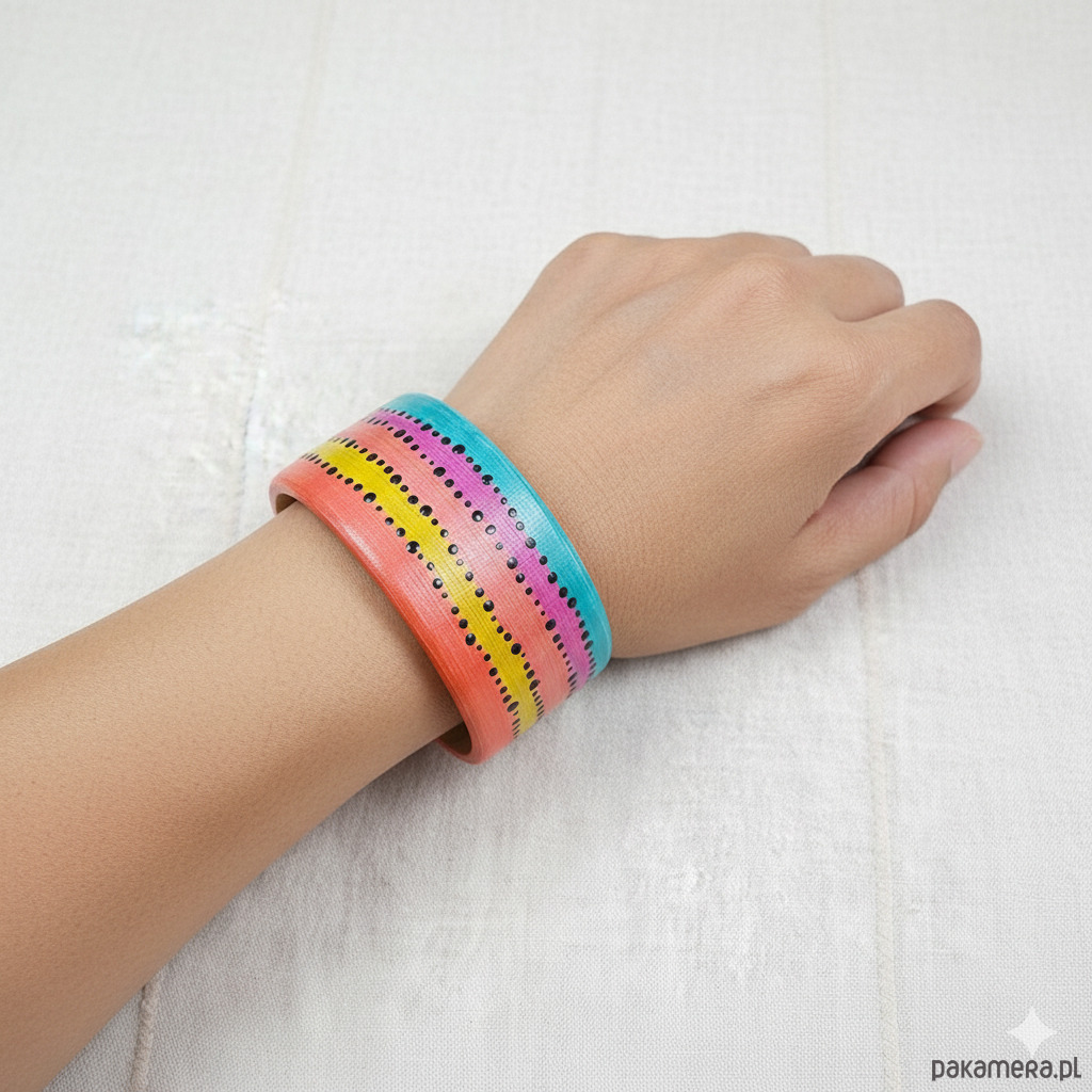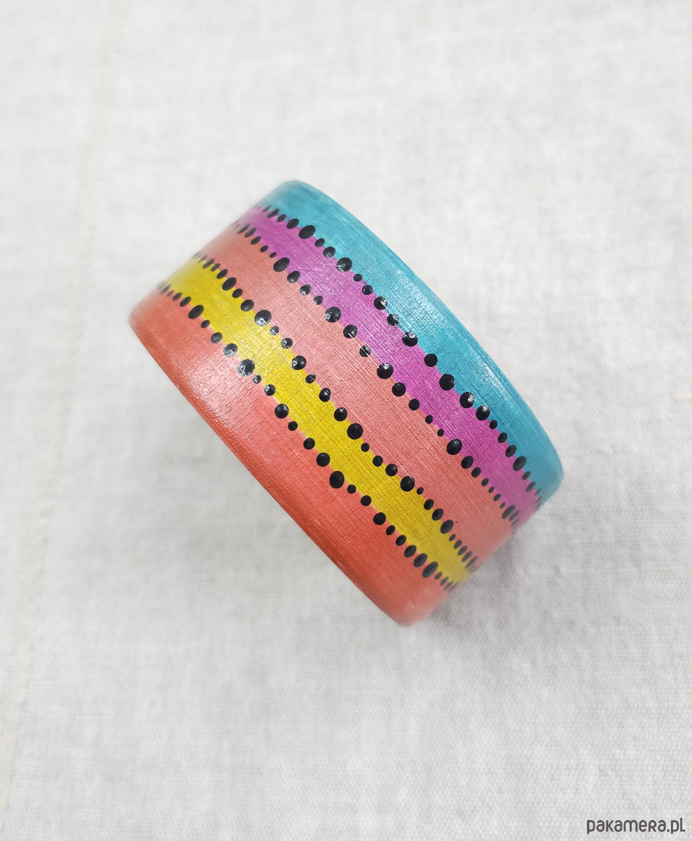 Bransoletka została ręcznie pomalowana w radosne, poziome pasy o intensywnych barwach.