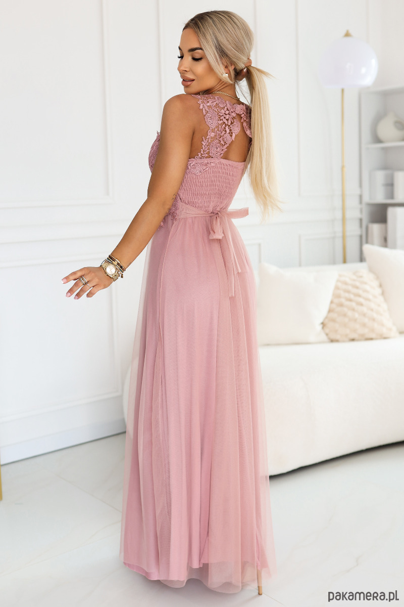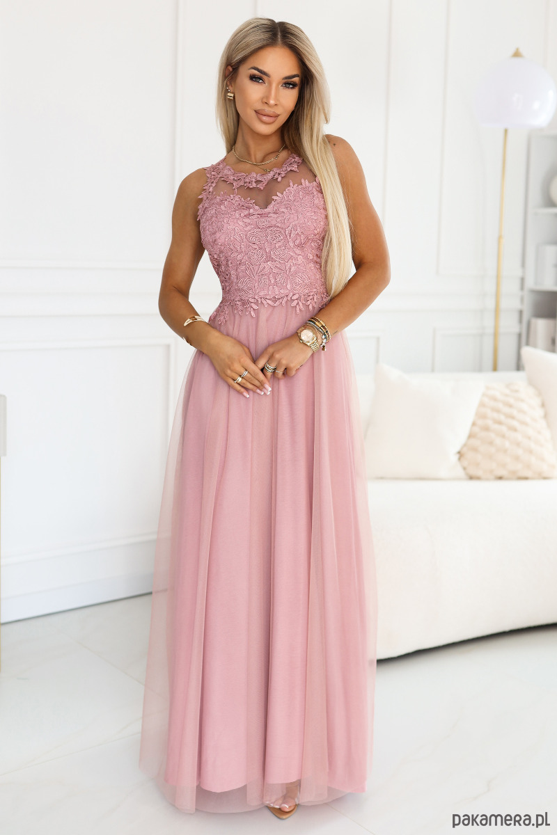 672-2 Romantyczna suknia maxi na wesele z haftowaną koronką i tiulem - pudrowy róż - UNI