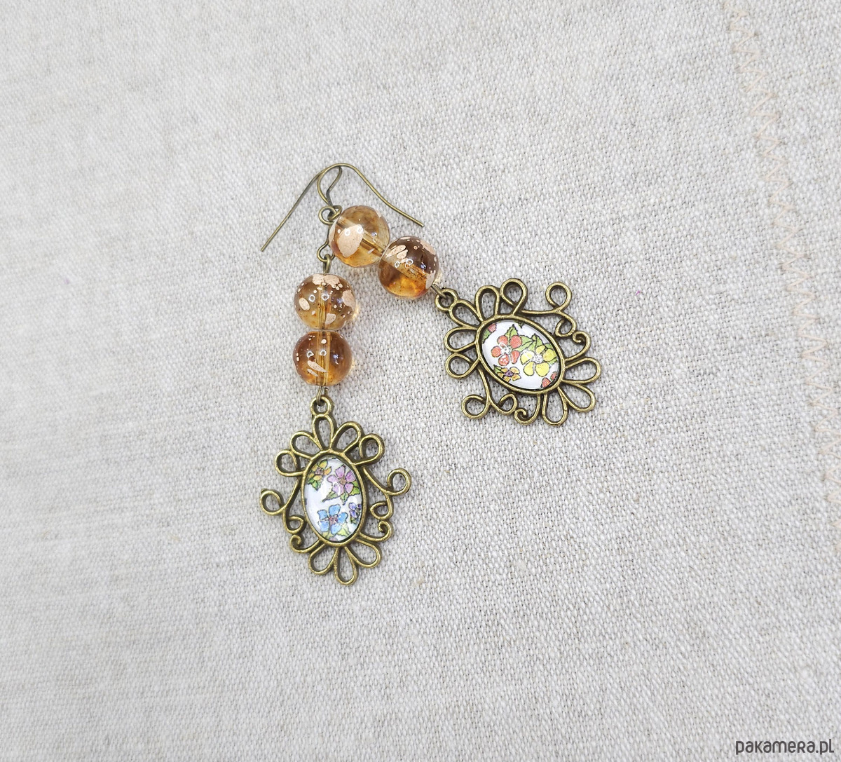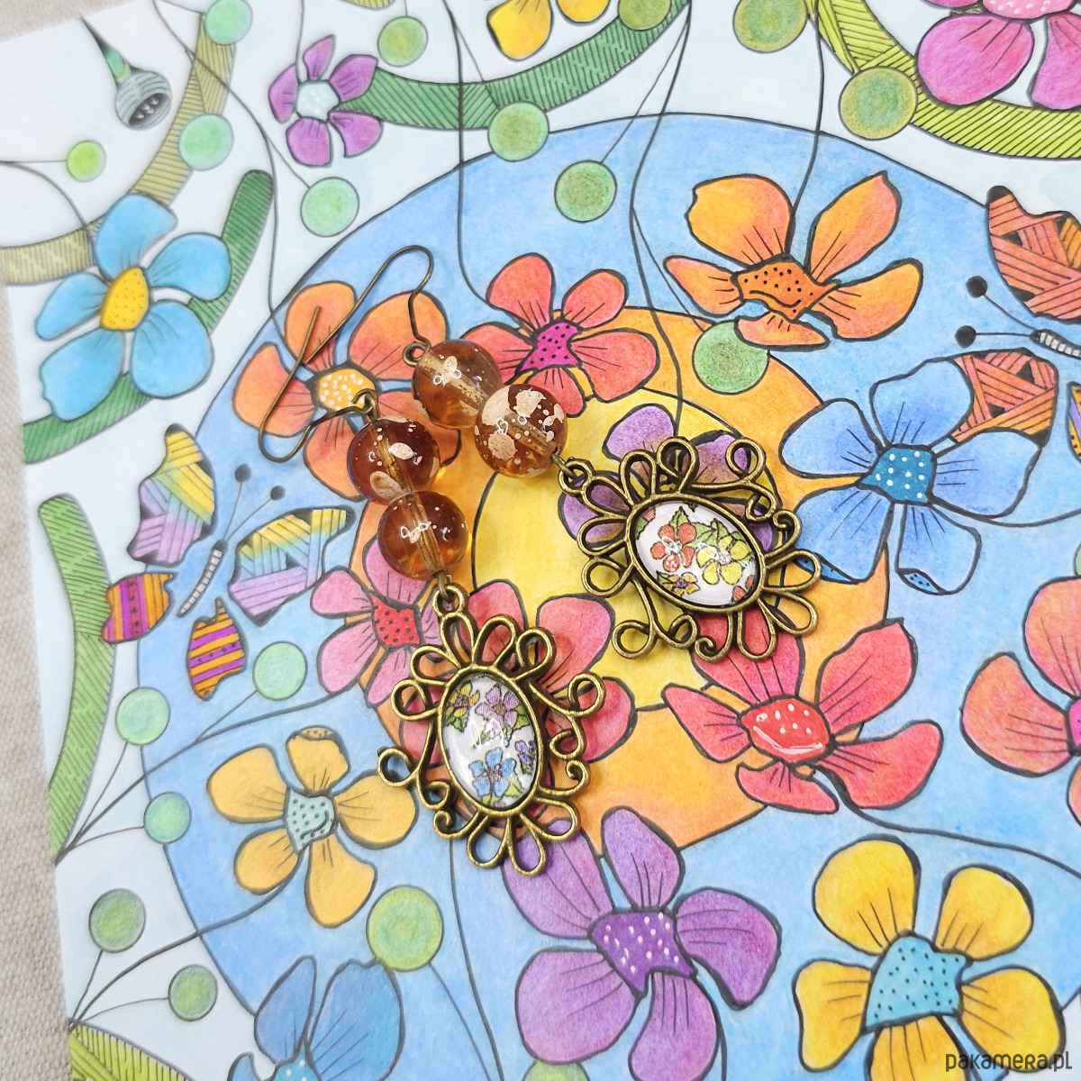 Kolczyki wykonane są z eleganckich, metalowych elementów w kolorze starego mosiądzu, które tworzą ażurowe, owalne ramy. Centralnym punktem każdej zawieszki jest kaboszon zawierający fragment rysunku mojego autorstwa, bezpiecznie ukryty i chroniony pod szkłem. Miniaturowe wzory kwiatowe, widoczne za szkłem, nadają kolczykom wyjątkowo romantyczny i osobisty charakter.