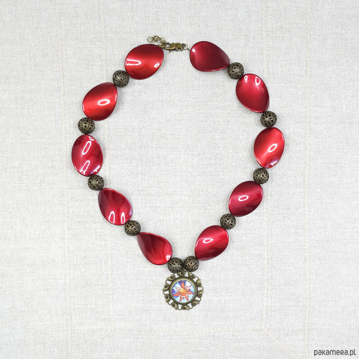 Naszyjnik wykonany z dużych, platerowanych korali (45 mm), metalowych, ażurowych korali (14mm) i fragmentu rysunku mojego autorstwa ukrytego za szkłem w wisiorku.