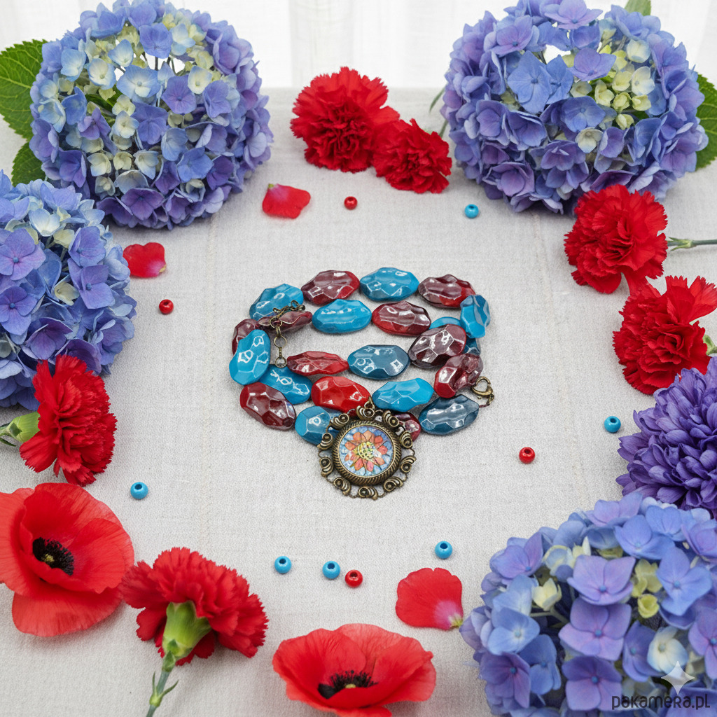 6743 duży, czerwony, niebieski naszyjnik z wisiorkiem; wisiorek kwiat