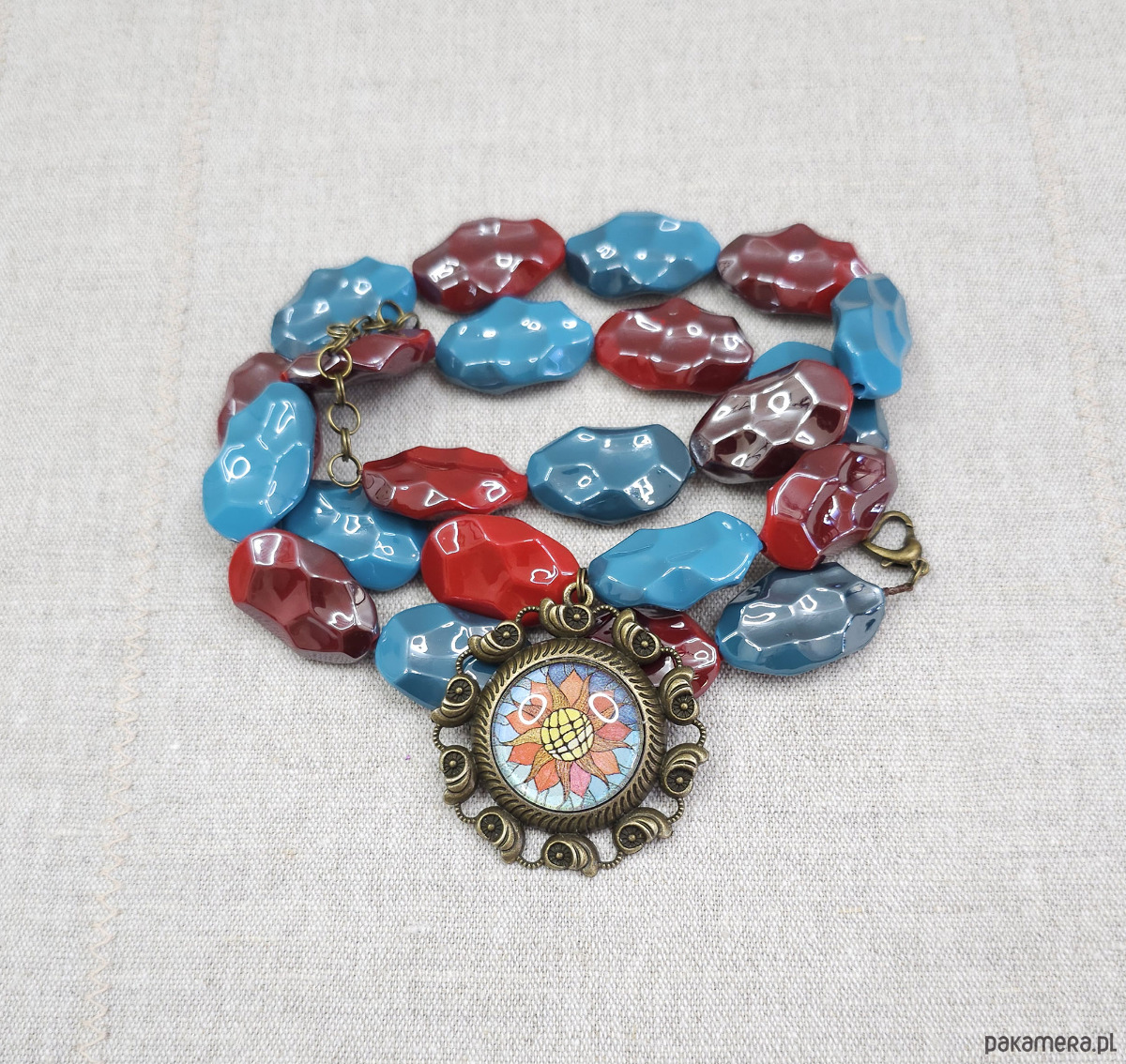 Naszyjnik wykonany z dużych akrylowych, platerowanych korali (30 mm) i fragmentu rysunku mojego autorstwa ukrytego za szkłem w wisiorku.