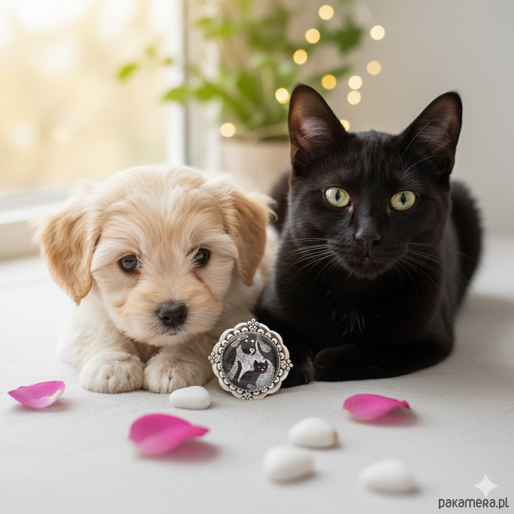 Odkryj uroczą broszkę z motywem psa i kota symbolizującą równowagę i harmonię w przyjaźni.