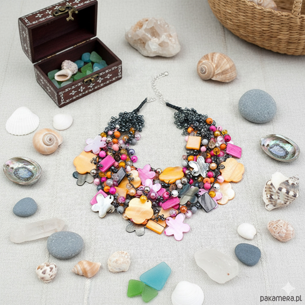 Ten naszyjnik to harmonijne połączenie kwiatów z masy perłowej, błyszczącego szkła i naturalnych koralików z drewna i akrylu. Ręcznie robiony z pasją, tworzy unikalną kompozycję, która jest jednocześnie elegancka i pełna wdzięku.